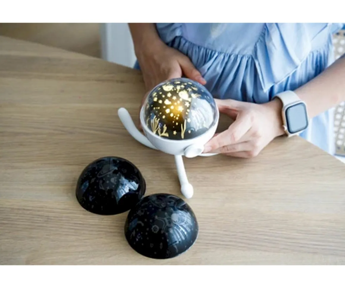 - Con el botón de encendido podrás cambiar el modo de funcionamiento: proyección luz blanca, luz azul, luz amarilla cálida, luz tres colores y mezcla de tres colores y gradiente de tres segundos