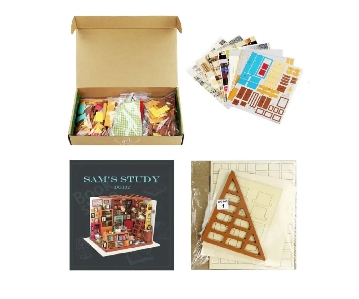 Con el kit Estudio de Sam podrás construir una mini biblioteca con preciosos accesorios y muebles decorativos y todo tipo de detalles cotidianos.Requiere tiempo y podrás colorear,ensamblar,coses y convertirte en todo un arquitecto.