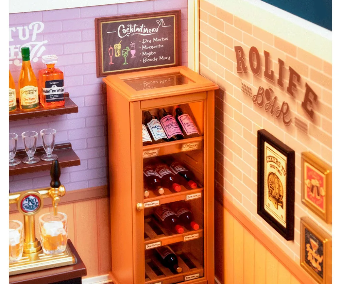 Este original bar es una maqueta con todo tipo de detalles en miniatura de recreación de la serie Super Store de Rolife Super Creator cuya base está formada de tres placas de plástico fáciles de conectar, una novedosa forma de recrear ambientes.