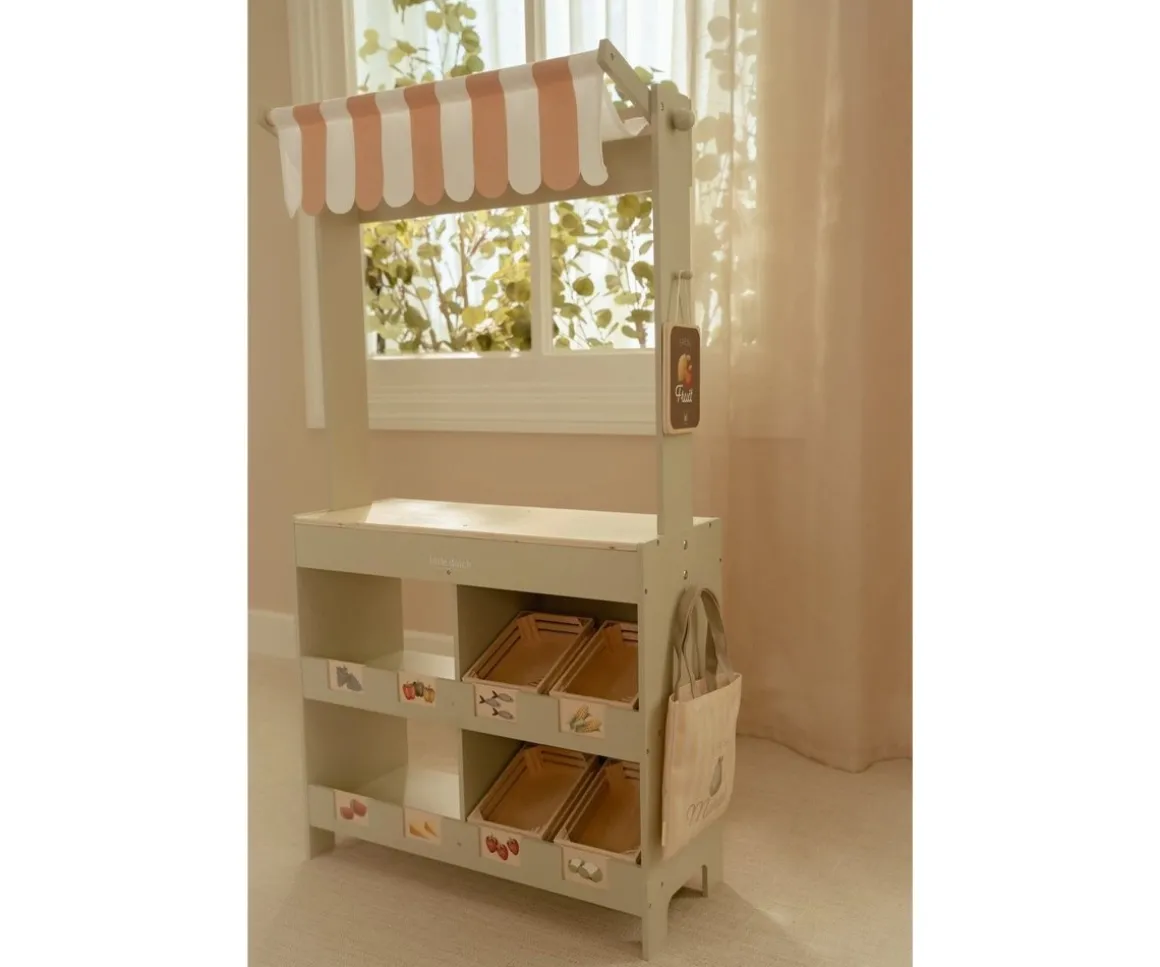 Con el Mercado FSC de Little Dutch, los peques pueden jugar durante horas a vender frutas, verduras, dulces o lo que imaginen en su propia tiendita. Gracias a su diseño de madera sostenible y detalles realistas como la marquesina de tela, la pizarra o las tarjetas ilustradas de productos, este puesto se convierte en el escenario perfecto para recrear experiencias cotidianas de forma divertida.