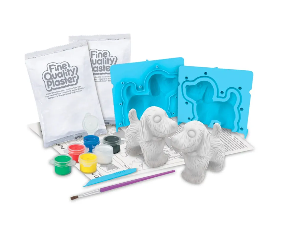 - Contiene: molde de perrito, herramientas para esculpir, 2 paquetes de polvo de escayola, pinturas, pincel, instrucciones