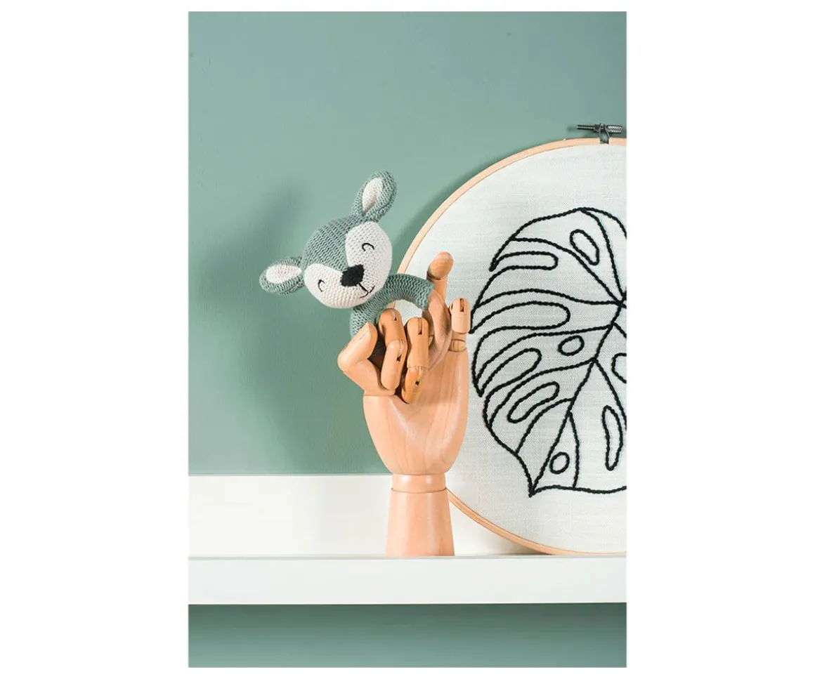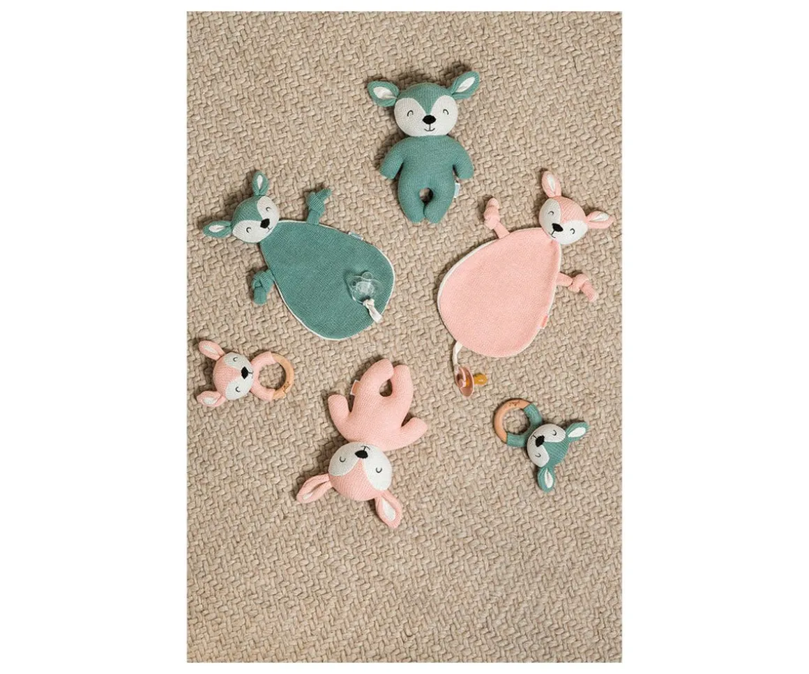 Este precioso ciervo es a la vez un mordedor,para que los peques de la casa puedan aliviar sus encías durante el proceso de dentición, y un sonajero, pues cuenta con una campana en su cabecita.Tiene la forma y el tamaño perfecto para que los peques puedan manejarlo con facilidad.
