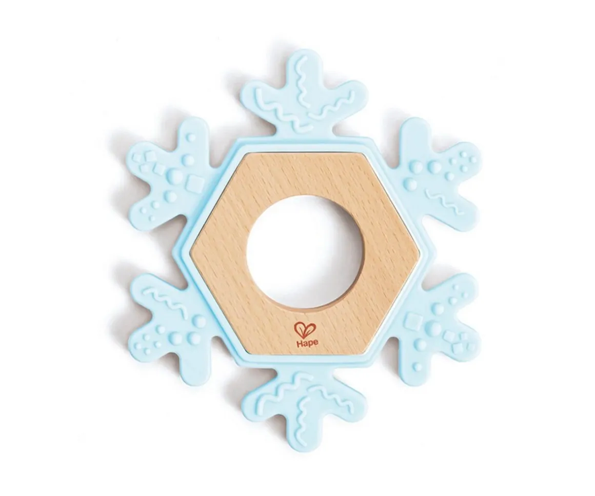 Bonito mordedor en forma de copo de nieve con superficie rugosa para ayudar a masajear las encías del bebé.