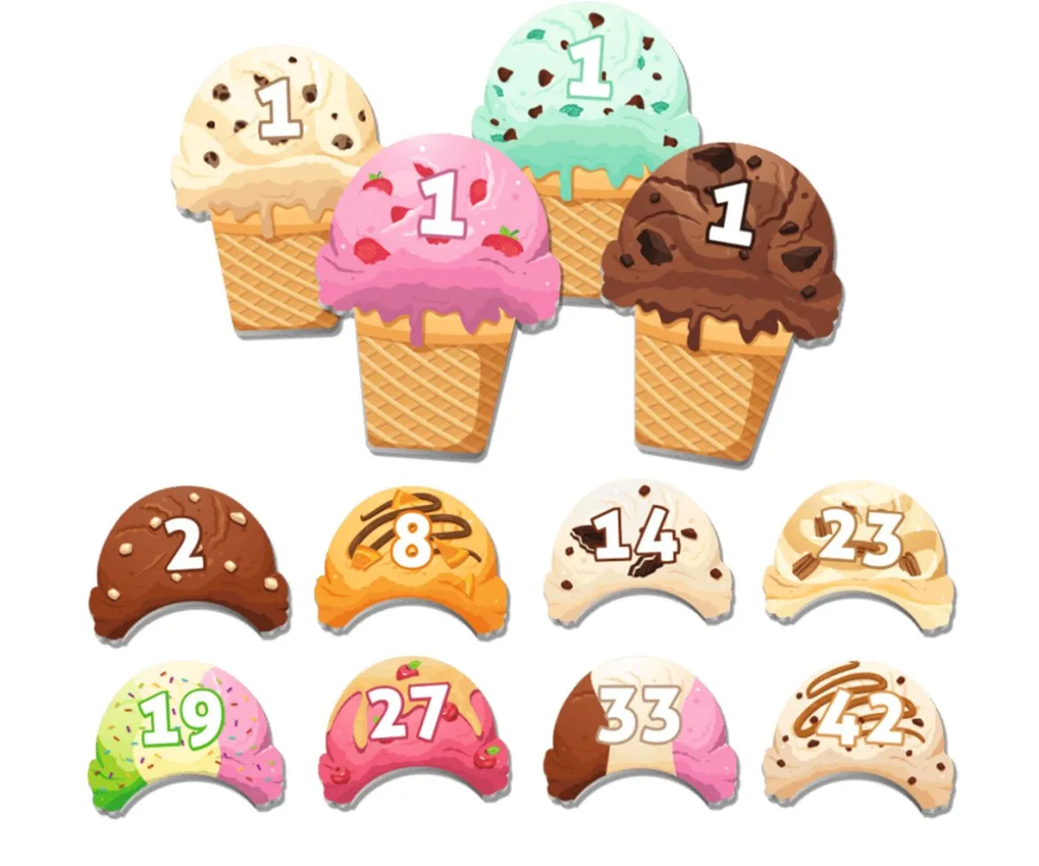 - Cada jugador empieza con 1 cono y 1 bola de helado. Las demás bolas están numeradas del 2 al 49 y se colocan bocabajo en la mesa.