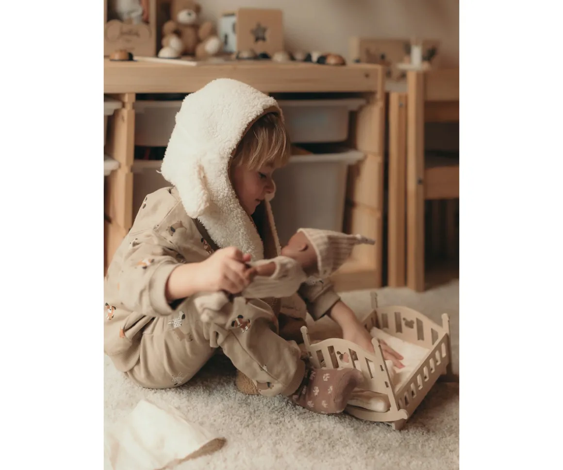 Cada Lupita incluye una preciosa cuna mecedora de madera y un set de ropa de cama compuesto por colchón, almohada y sábana, creando el escenario ideal para el juego simbólico y las rutinas de cuidado.