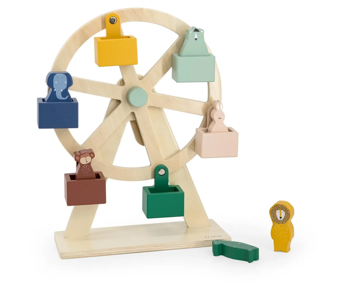 Todos los animales disfrutan de un paseo en la noria. Los niños pueden hacer girar la rueda usando la manija de la parte posterior.