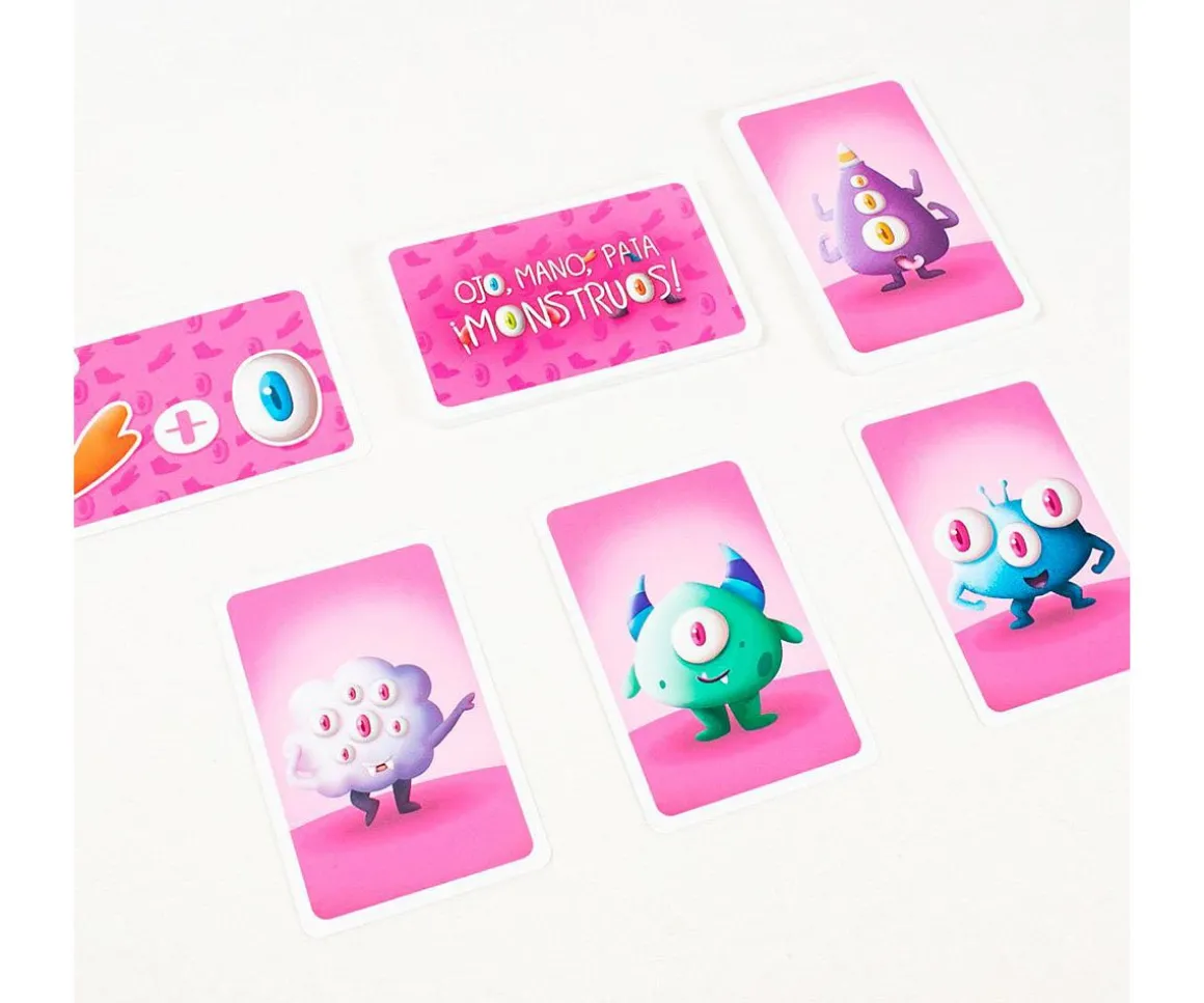 Divertido juego de cartas compuesto por 20 cartas con ilustraciones de monstruos en una cara y en el otro lado indicando el número de ojos, manos y patas que tienen. Con 3 niveles de dificultad, el objetivo será conseguir el mayor número de estrellas de las cartas de reto, siendo el más rápido en adivinar correctamente el número correcto final.