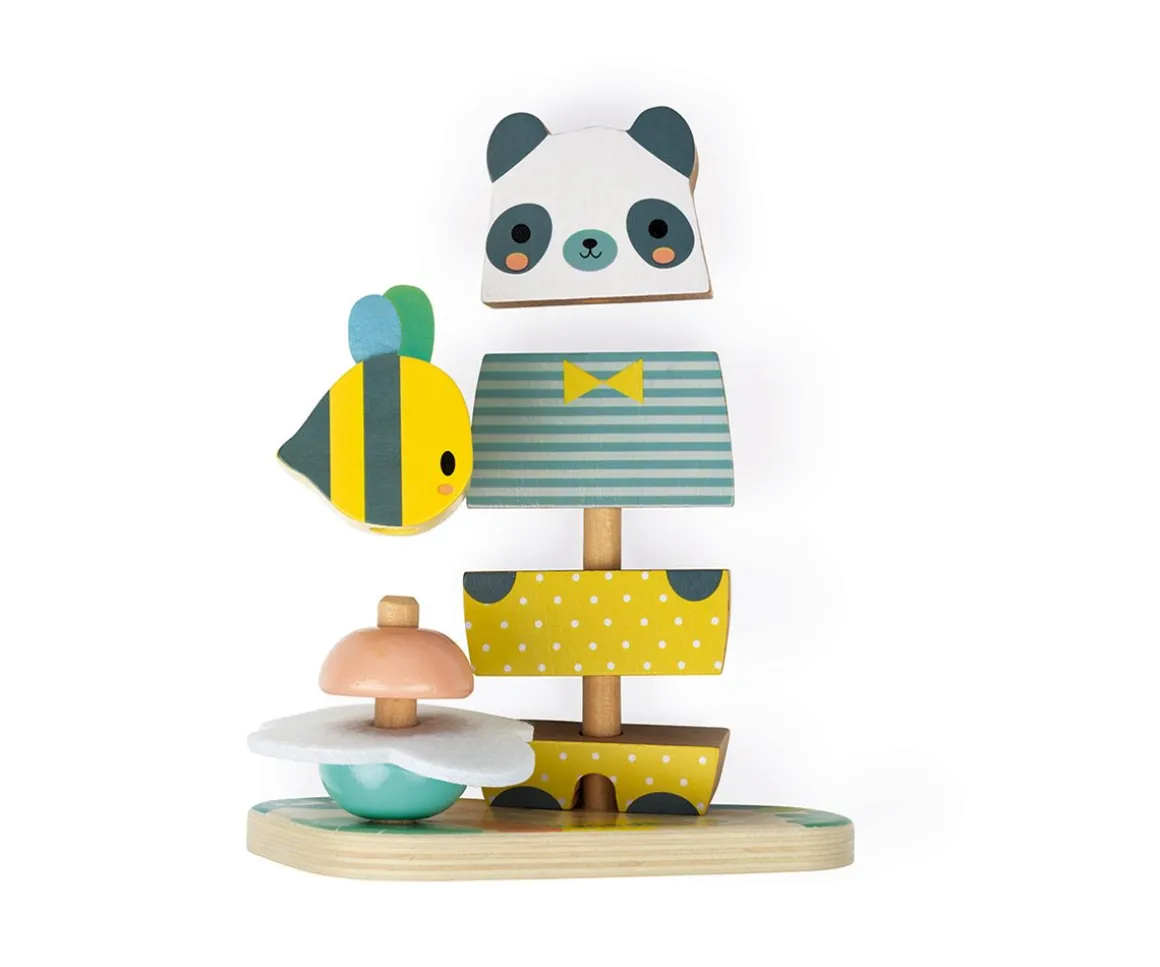 Un bonito juego apilable 2 en 1: un osito en un lado y un panda en el otro, acompañados por su amiguita la abeja. Con este juguete los pequeños aprenderán a insertar cada pieza en el orden correcto