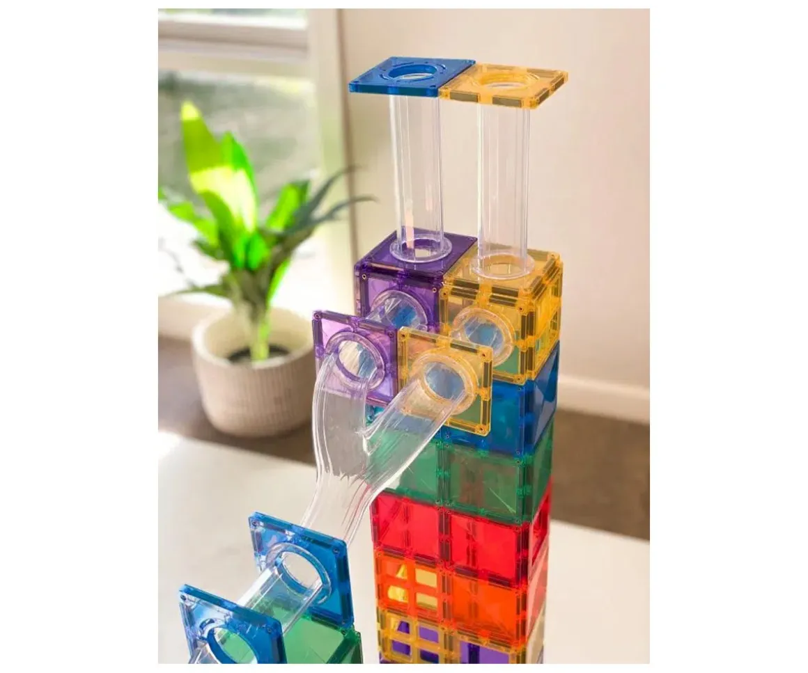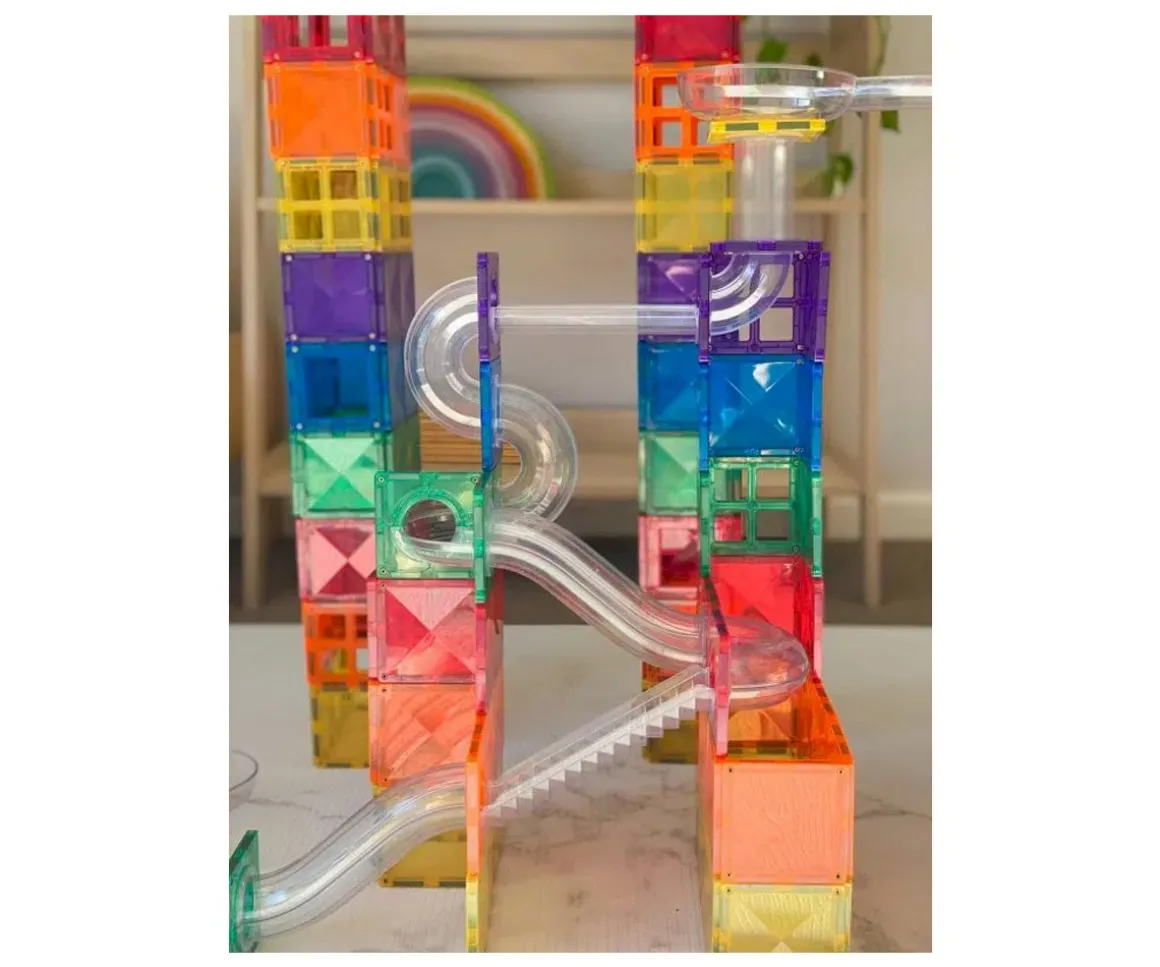 - Incluye: 36 cuadrados de conexión, 6 bolas de madera, 2 tubos dividos en forma de Y, 2 escaleras largas, 2 tubos de curva en S, 8 tubos en forma de U, 8 tubos deslizantes, 12 tubos de ángulo recto, 6 tubos rectos largos, 8 tubos rectos cortos, 2 cuencos