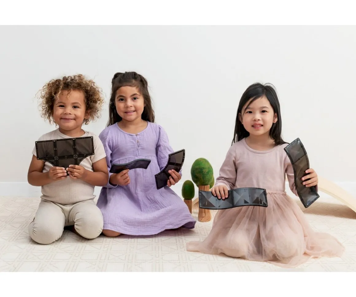 El pack de 48 piezas de Connetix incluye arcos, instersecciones, cuartos de círculoo y rampas largas y cortas en color negro, para ampliar el juego y la imaginación de los peques mientras construyen una y otra vez.
