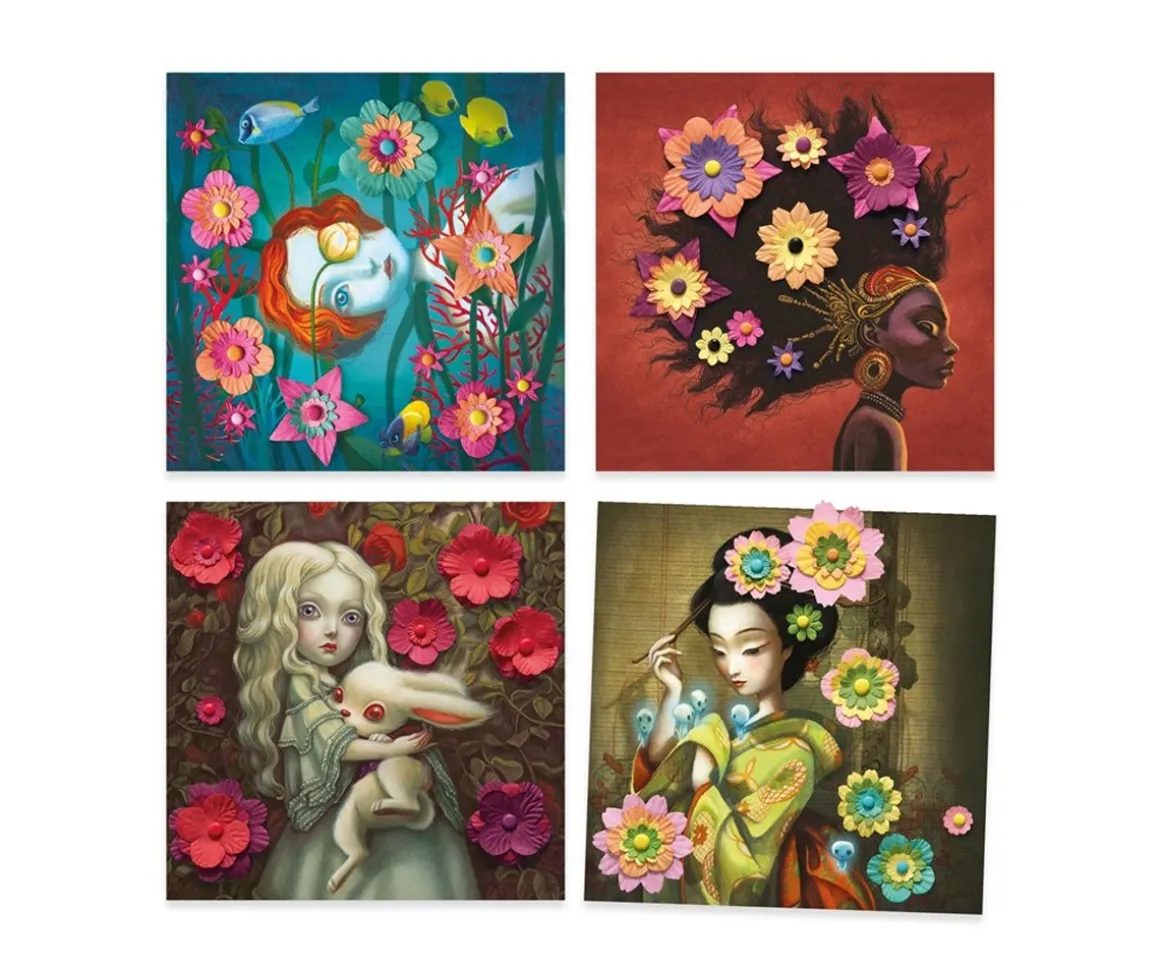 ¡Crea obras de arte florales 3D sobre estos 4 retratos ilustados con Djeco!