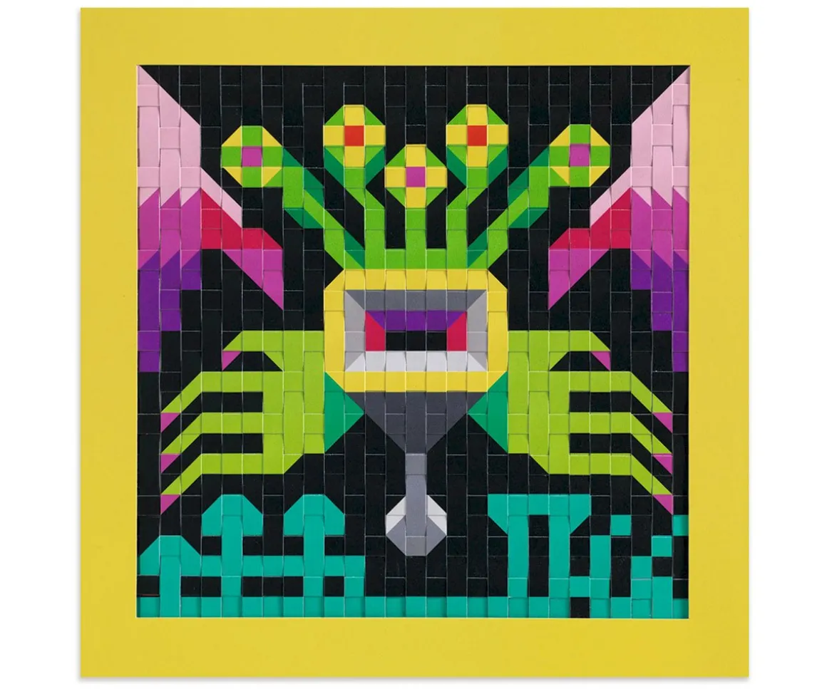 Estupendo set para tejer con tiras de papel y fabricar 4 cuadros estilo pixel art. Los peques deberán deslizar las tiras de papel en la cuadrícula parcilamente impresa. Los robots, extraterrestes y ovnis irán apareciendo poco a poco.