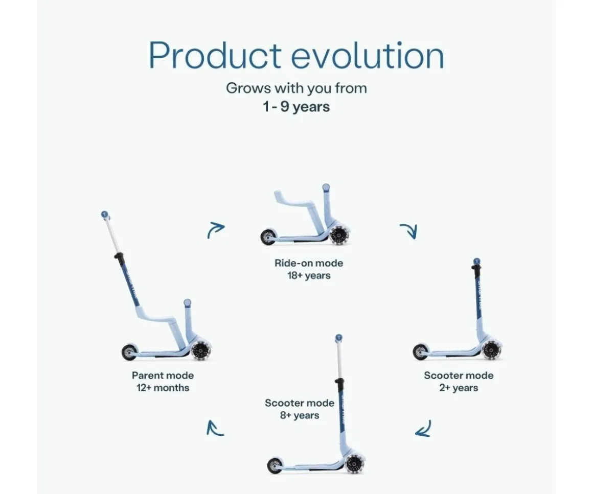 Desde una bicicleta para caminar acompañado, un scooter, hasta un patinete con manillar extensible para adaptarlo a la altura de tu peque por lo que este patinete pueden utilizarlo desde un añito hasta los 9.Cuenta con un práctico y cómodo asiento para sus dos primeras etapas.