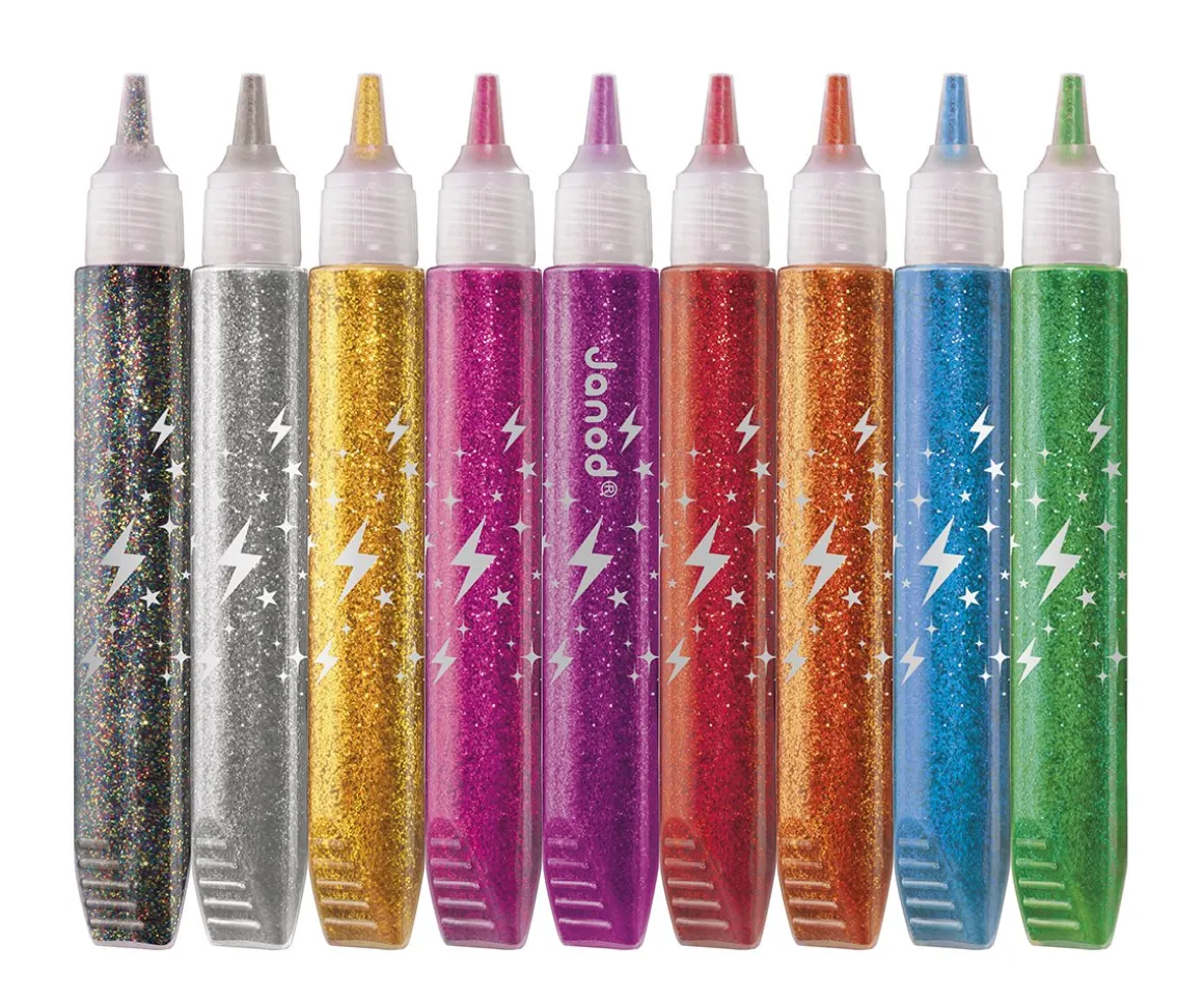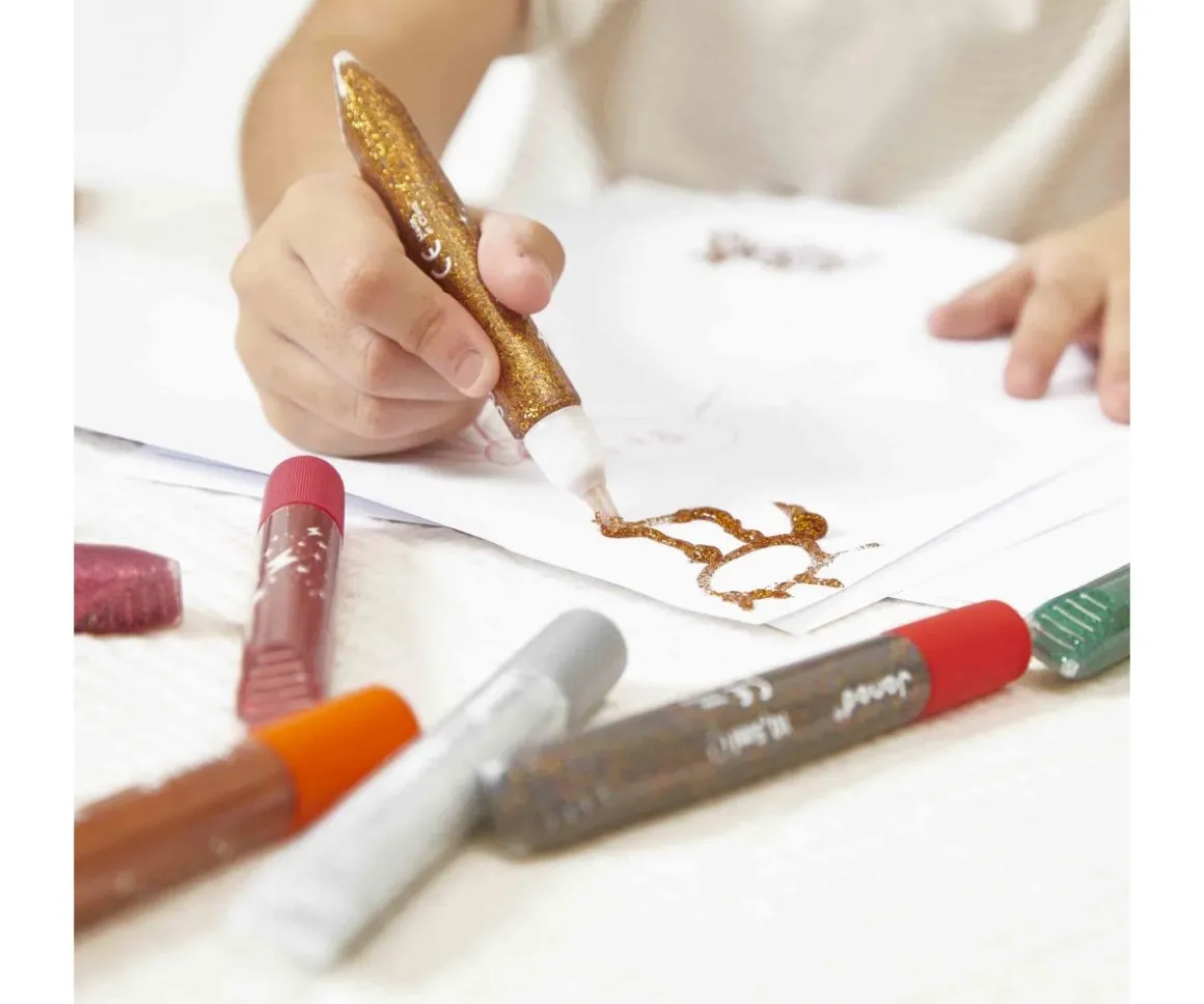 Set de 9 tubos de pegamento con purpurina en colores vivos de Janod, incluidos dorado y plateado. Con punta precisa y alta densidad de brillo, son ideales para decorar con detalle y estimular la creatividad de los más pequeños.