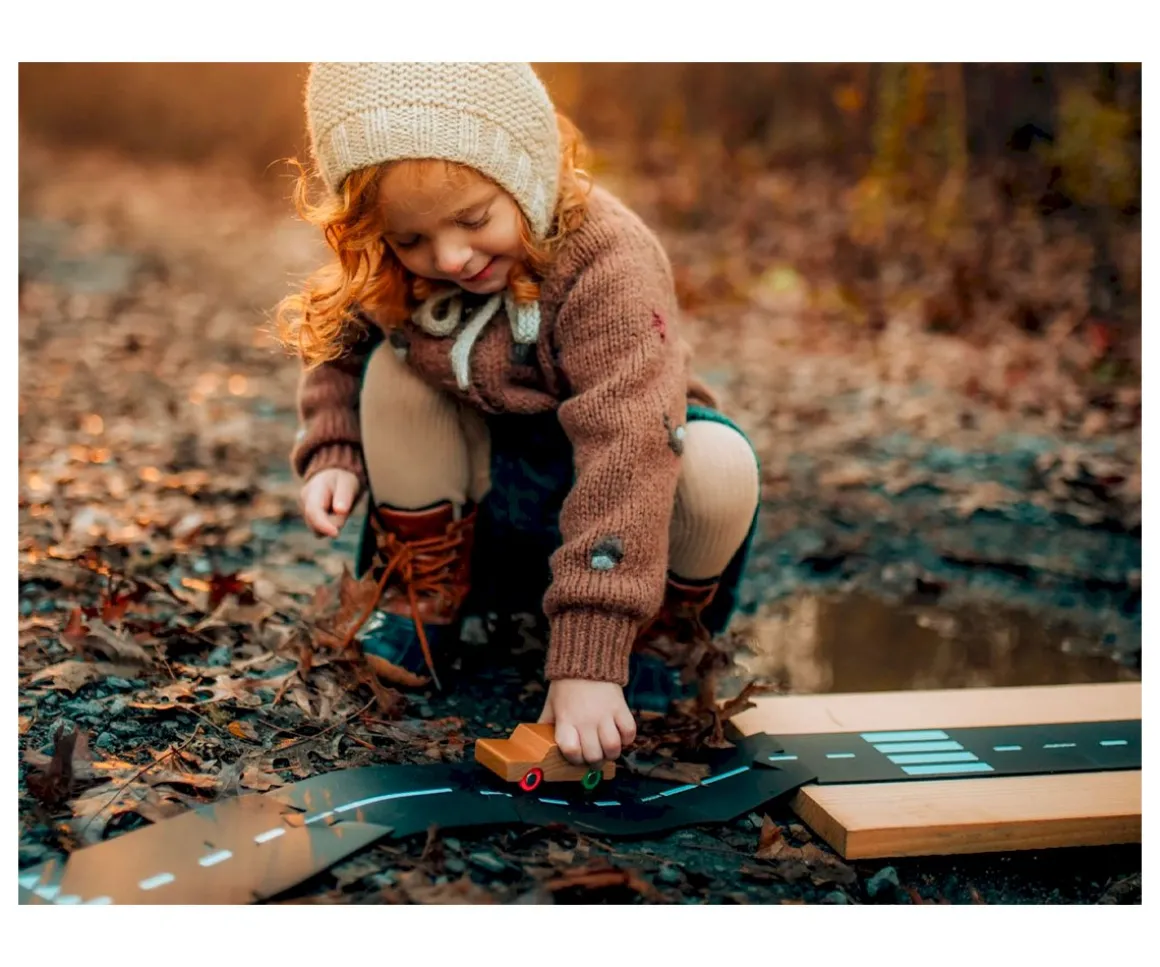 El circuito es perfecto para usar tanto en interior de casa como en exteriores.Además incluye un coche de madera con ruedas de colores para probar el circuito.