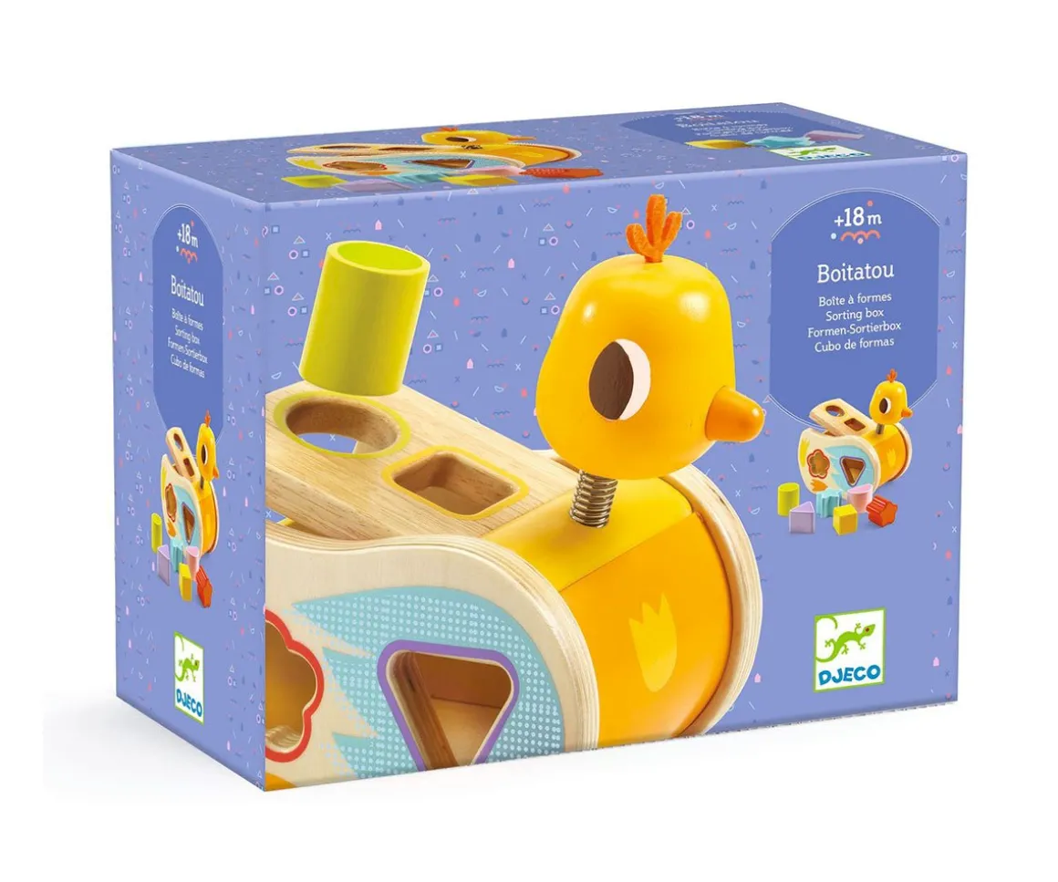 Esta preciosa cajita con forma de pollito está hecha de madera natural. Consta de 6 piezas de diferentes colores y formas que se introducen en la caja. Los peques deberán deslizar las formas en los orificios adecuados.