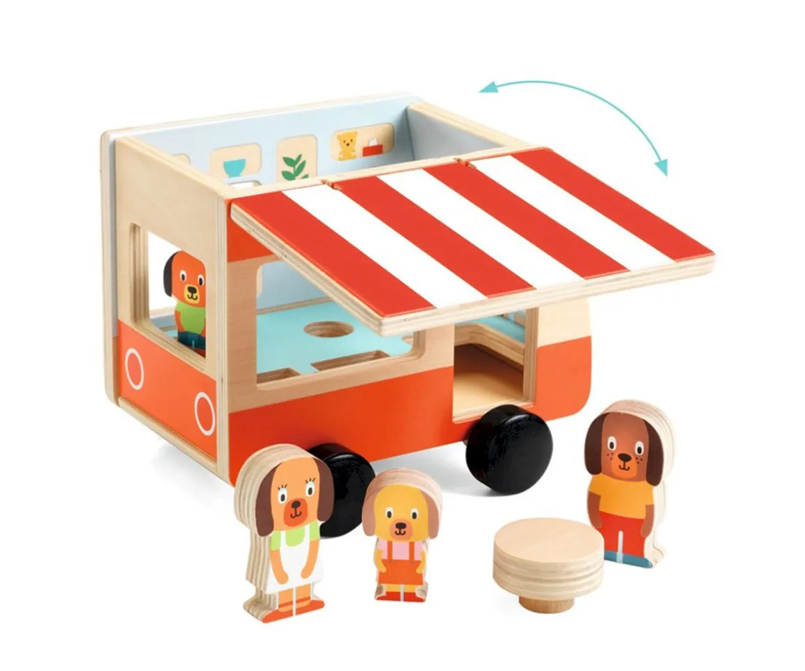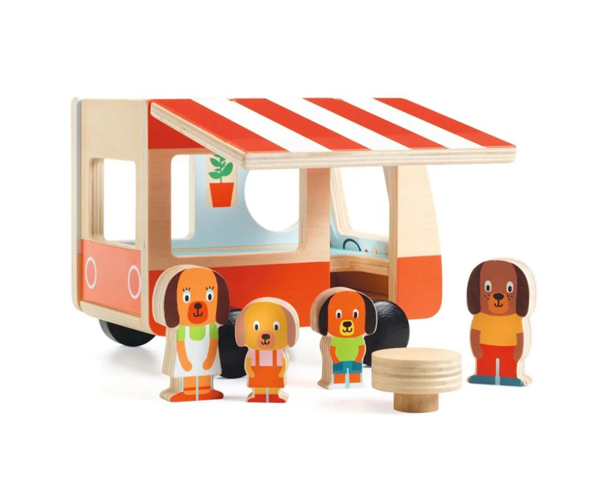 Esta bonita caravana de madera está pensada para los más peques de la casa. Es muy divertidad y esta llena de detalles tanto en su interior como su exterior. Dentro descubrirás una familia de perritos con los que el peque podrá divertirse inventando un sin fin de historias. Su techo se abre convirtiéndose en toldo.
