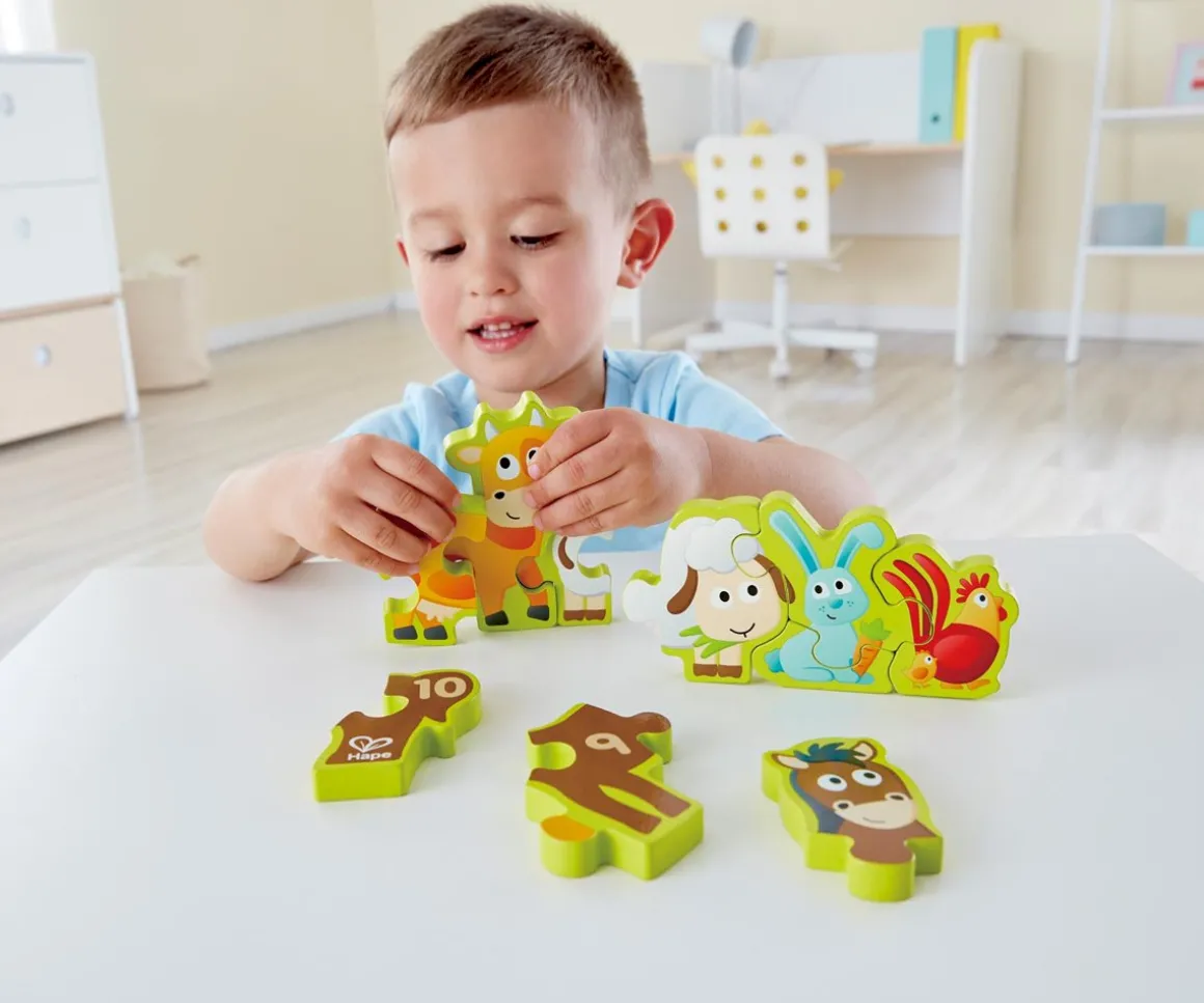 Puzzle de madera de 10 piezas con amplia base para dejarlo en posición vertical sobre la mesa y diseñado con bonitos animales de granja en un lado y los números del 1 al 10 en el otro.