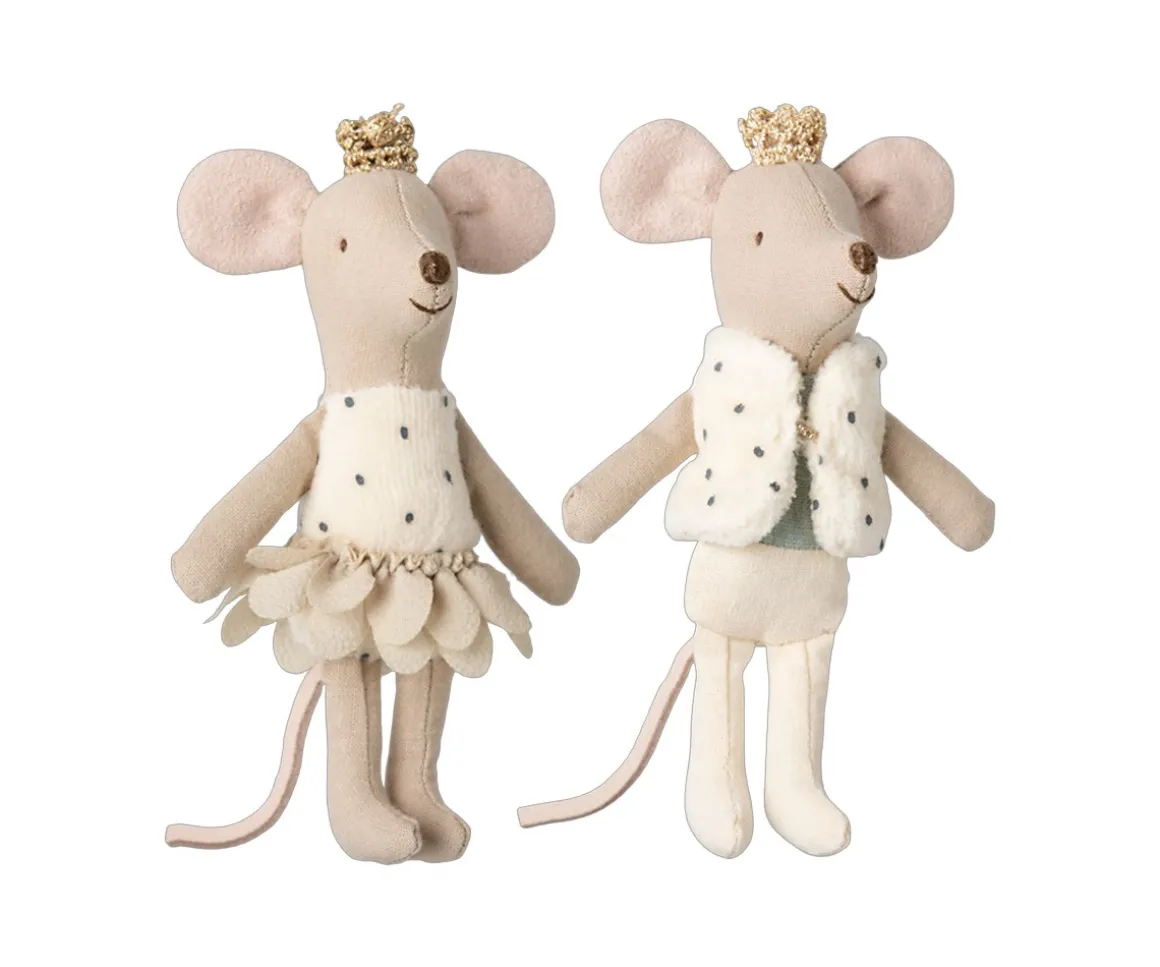Dos hermanitos gemelos reales ratón hermano y hermana pequeños. Duermen en una cajita de cerillas y llevan puestas coronas y preciosos atuendos reales, además en la cajita se encuentra ropa de capa para que su descanso sea lo más cómodo posible.