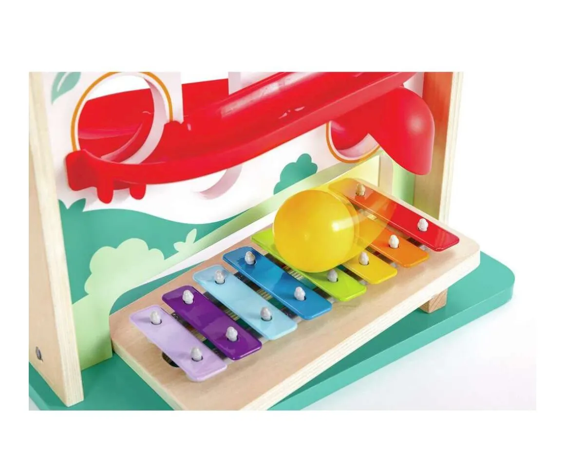 - Incluye: circuito de bolas con xilófono incluido, martillo, varita para tocar el xilófono, 2 bolas