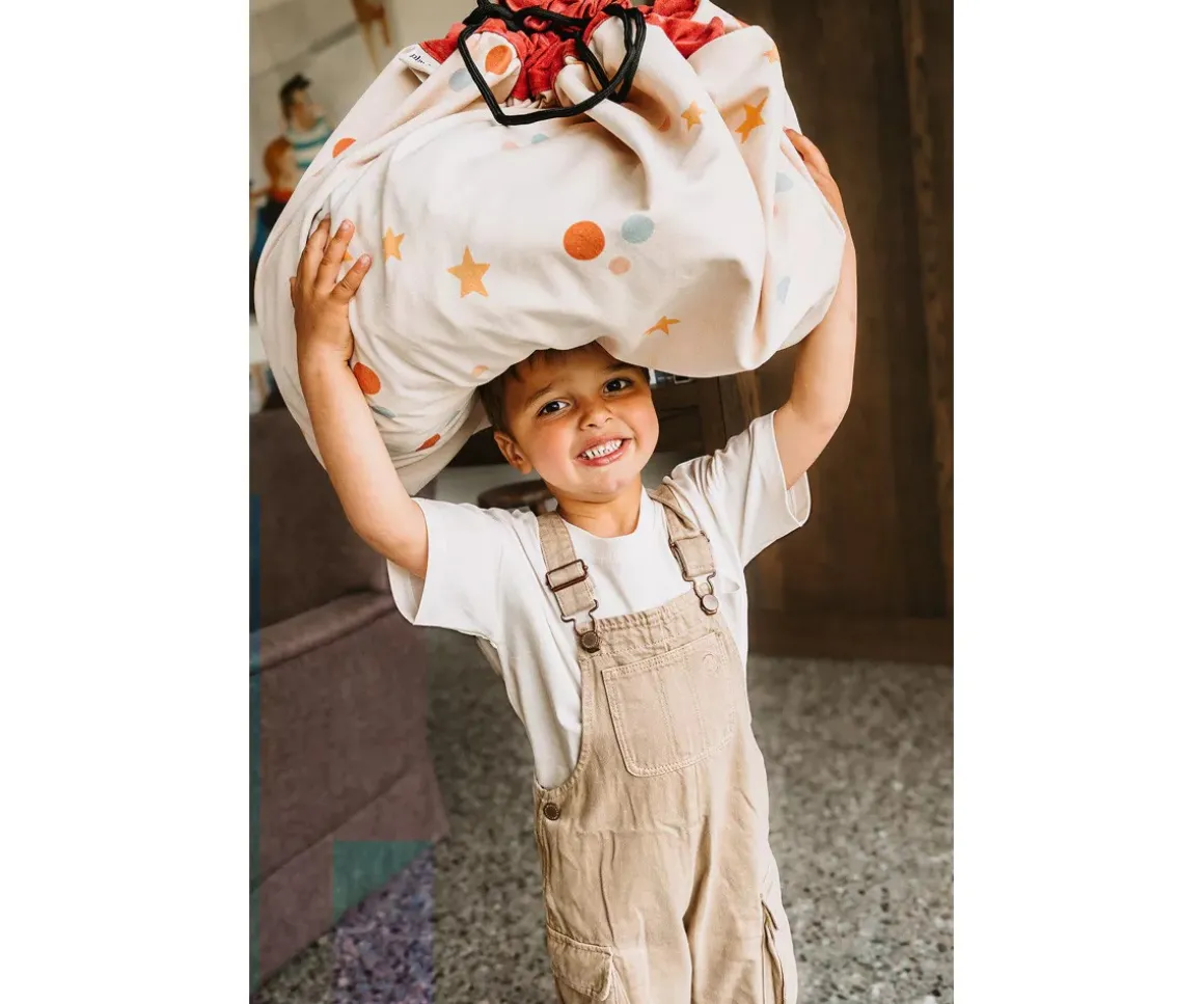 Este saco se desdobla y se convierte en una manta de juegos donde el niño puede jugar con todas sus juguetes, grandes y pequeños, y cuando llega la hora de acostarse, sólo hay que cerrarla y ya está todo recogido.