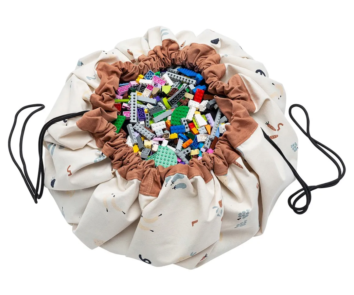 Este saco se desdobla y se convierte en una manta de juegos donde el niño puede jugar con todas sus juguetes, grandes y pequeños, y cuando llega la hora de acostarse, sólo hay que cerrarla y ya está todo recogido.