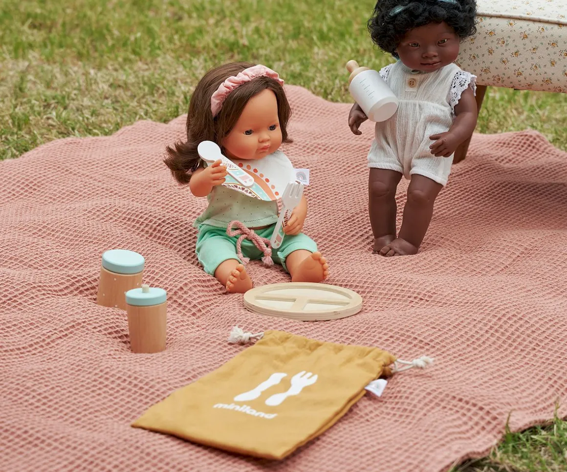 Incluye biberón, platito, biberón con pajita, bote de leche en polvo, cuchara, tenedor y una bolsita de tela para transportar y guardar todas las piezas.