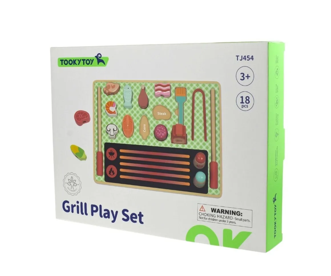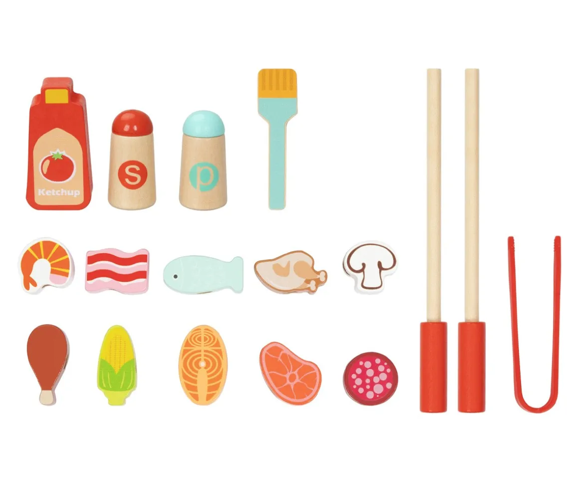 - Incluye: 1 base de madera, 17 piezas de madera (2 pinchos, 1 pinzas,1 espátula,1 salero, 1 pimentero, 1 bote ketchup,10 trocitos de comida variada)