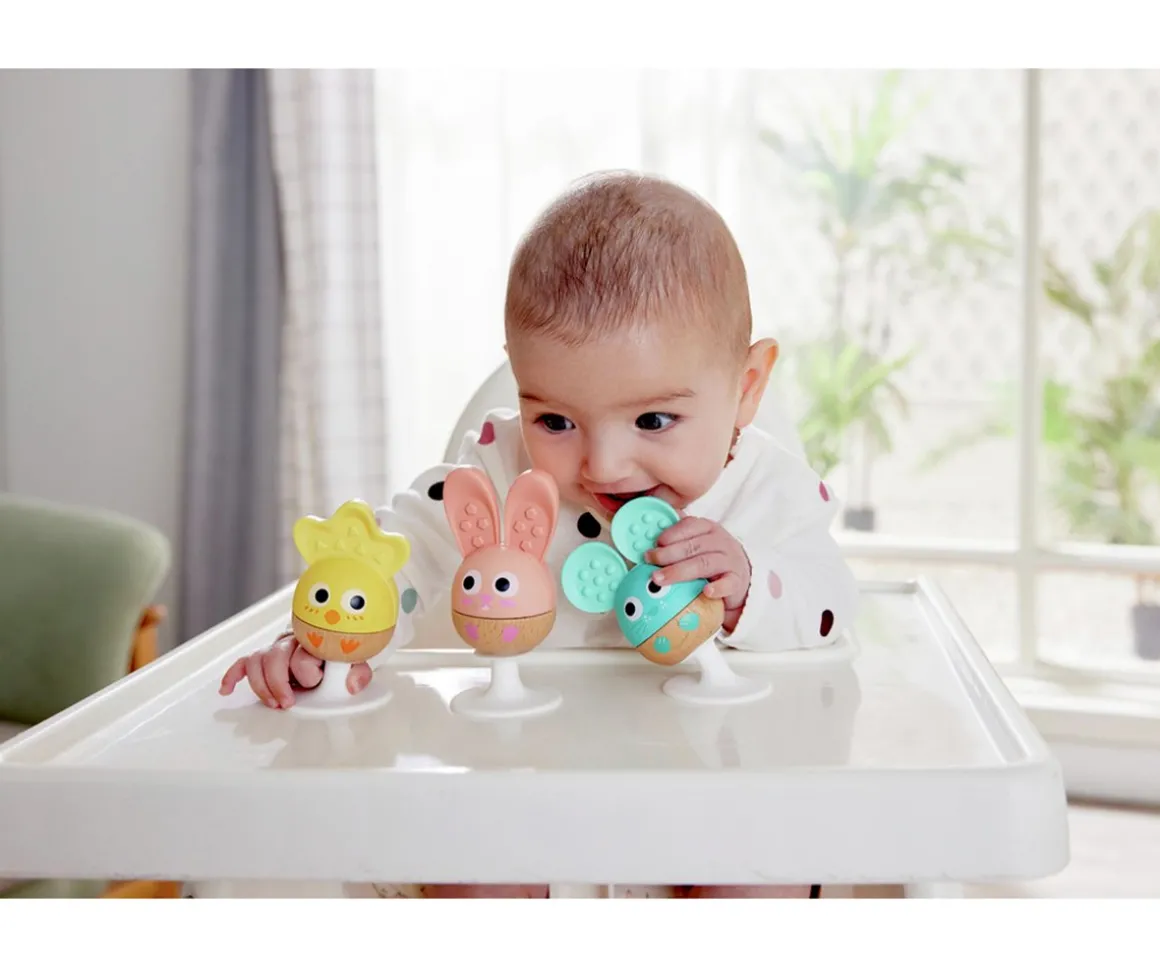 A los bebés les encantarán los distintos sonidos, los colores brillantes y los alegres animales de este set de sonajeros que se podrán adherir a superfícies lisas.