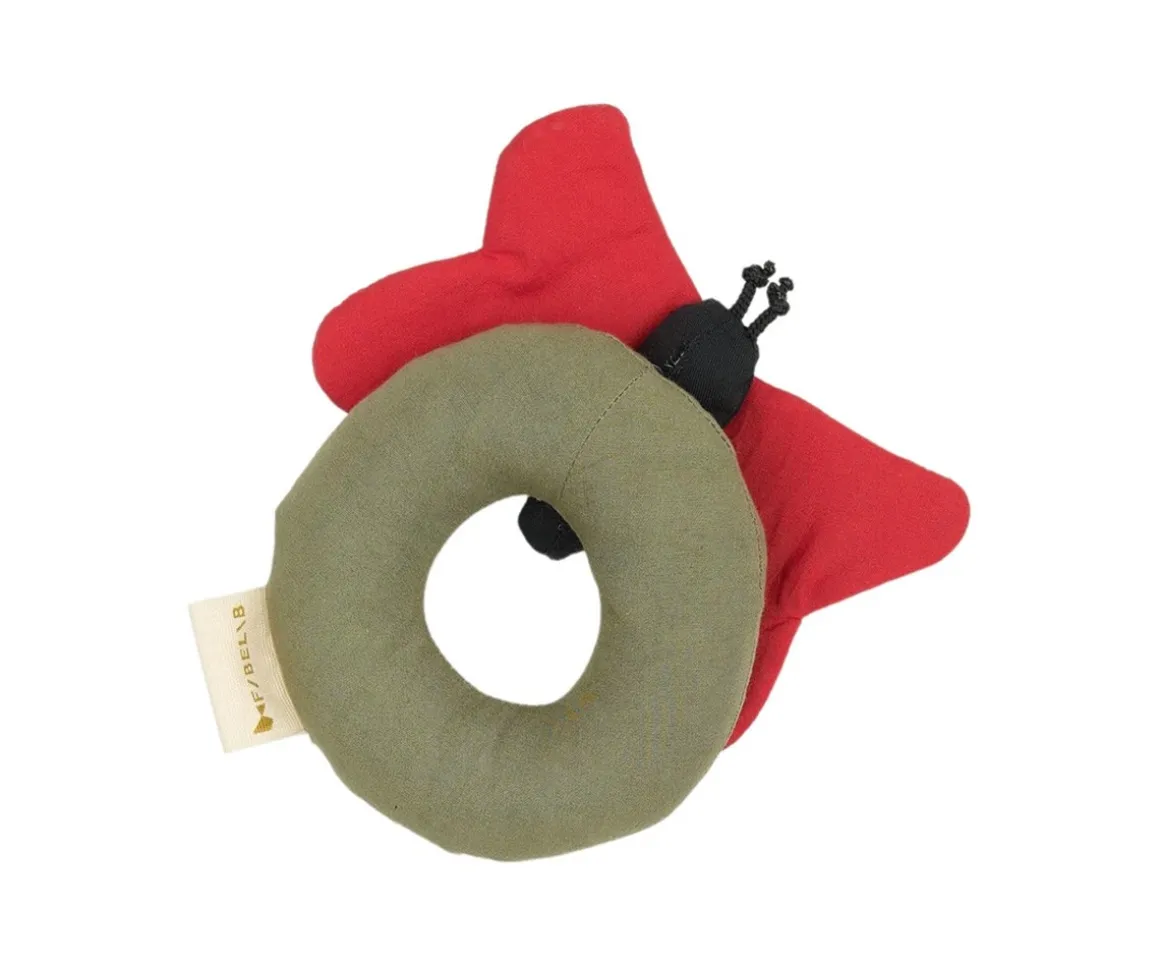 Un alegre sonajero con forma de anillo y una alegre mariposa de Fabelab,muy suave y fácil de agarrar por las manos más pequeñas. Está confeccionando en tejido de algodón aterciopelado.¡A los peques les encantará descubrir sus formas y agitarlo para escuchar el suave sonido del sonajero!
