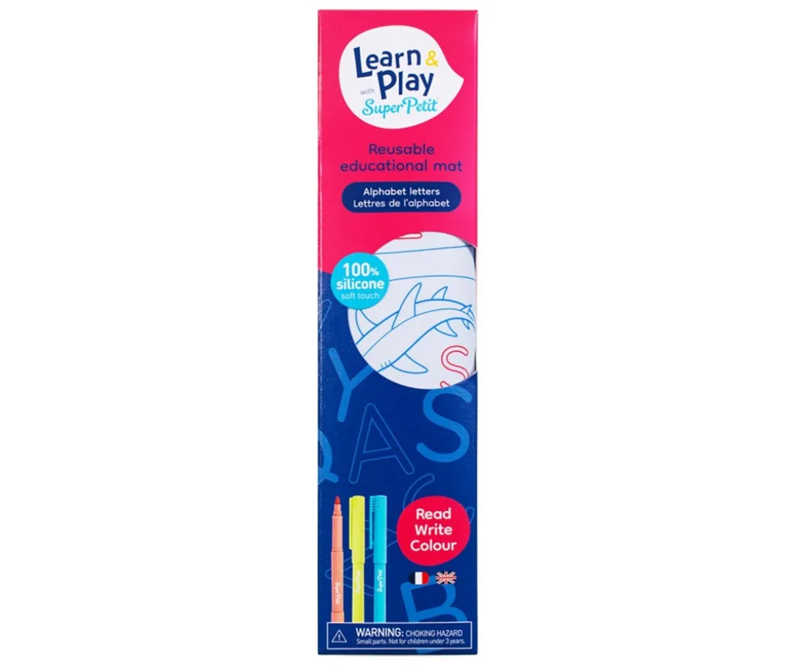 Este set mini de Super Petit es un salvamantel de silicona súper suave, ideal para que los más pequeños coloreen y aprendan las letras del alfabeto con dibujos de animales marinos, ¡en cualquier lugar!