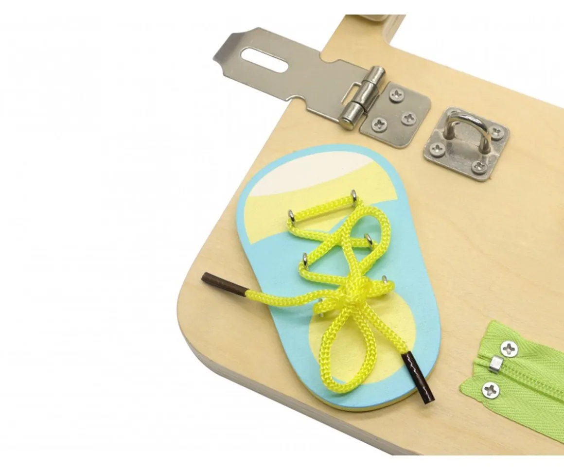 Tablero de actividades de madera para trabajar la motricidad y coordinación con las diferentes formas y cierres de pestillo y fijación.