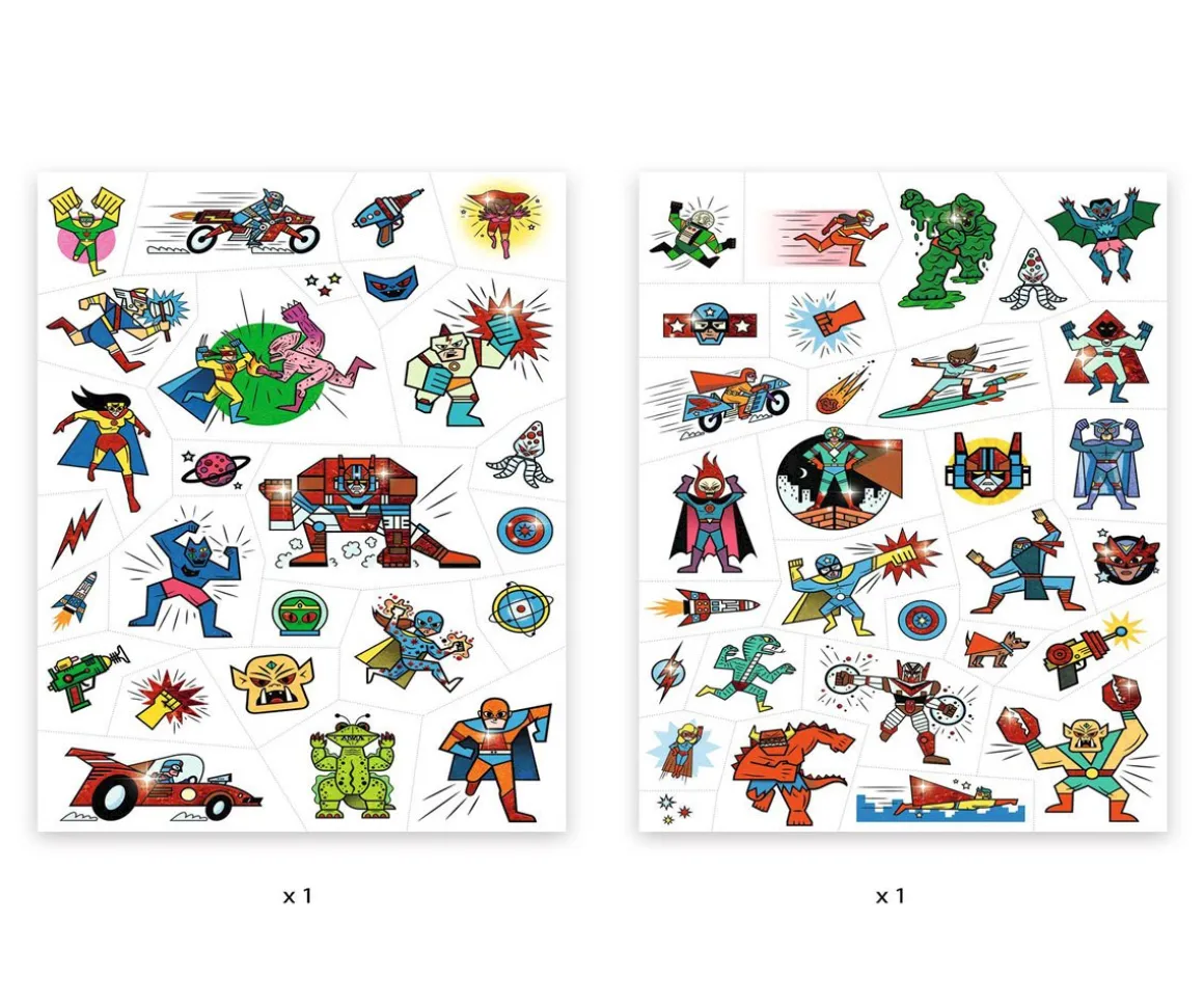 - Incluye 2 hojas de tatuajes de 14 x 21 cm