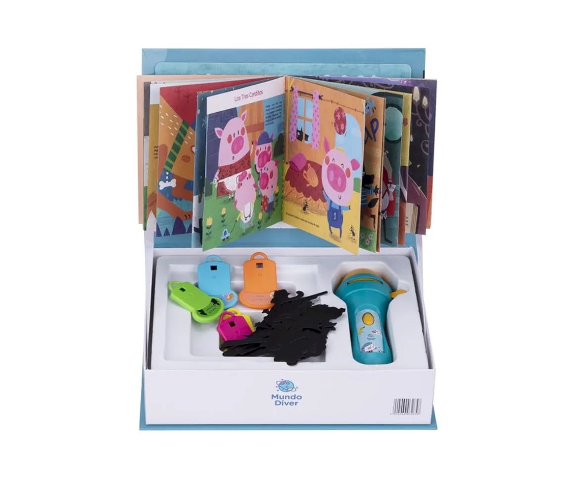 - Incluye: 4 discos de cuentos (La Sirenita, Los Tres Cerditos, El Patito Feo, El León y el Ratón), 1 disco de marionetas de sombras, 1 pequeño libro con imágenes (texto en inglés), 11 siluetas de personajes para el teatro de sombras