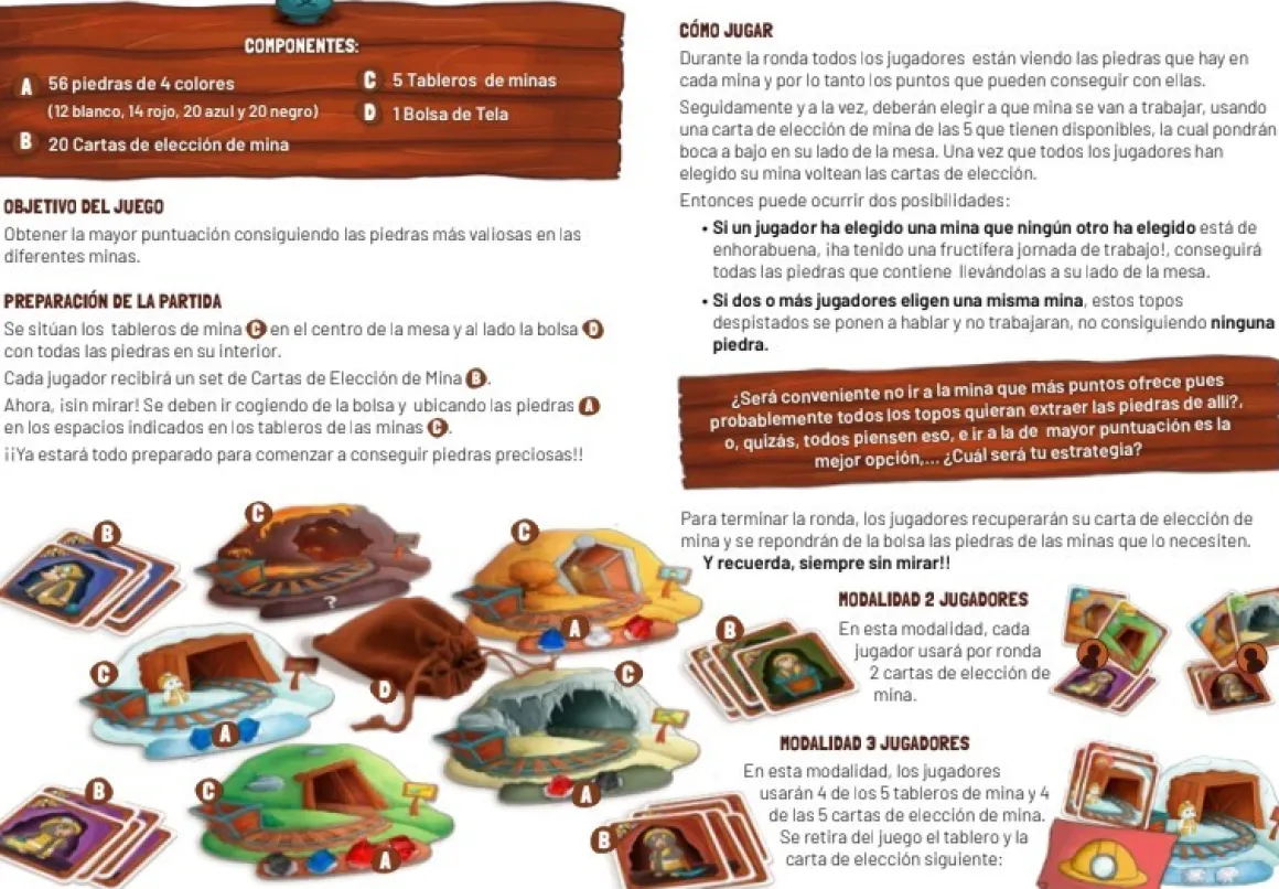 Coincidencia: Si dos o más jugadores eligen la misma mina, estos topos despistados se distraen conversando y no trabajan, por lo que no consiguen ninguna piedra.
