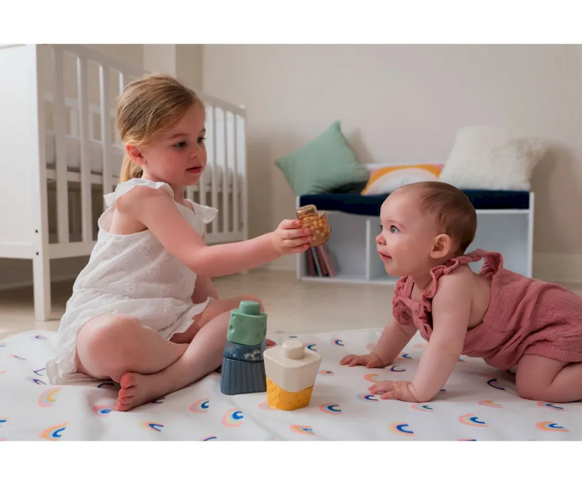 La torre, ideal para bebés de 6 meses, está formada por piezas para apilar, de diferentes colores y texturas. Algunas piezas contienen pequeñas gotitas de colores que podrán observar a través de sus paredes transparentes. Al agitar las piezas con gotas en su interior, se escuchará un suave ruido que simula al de la lluvia.