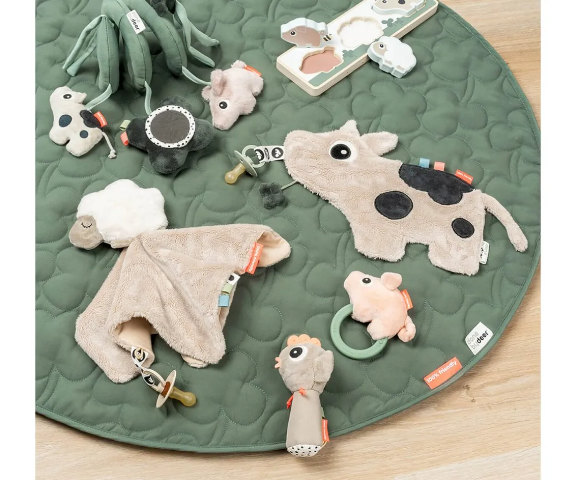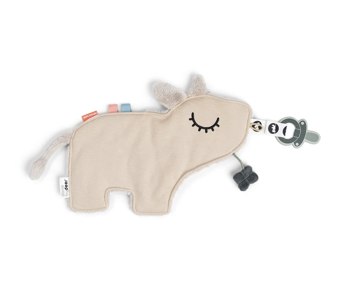 Este dulce chupetero de la colección de Done by Deer, es una adorable vaca con diferentes etiquetas y texturas para despertar la curiosidad de tu bebé y que pueda llevar el chupete bien agarrado de manera segura.