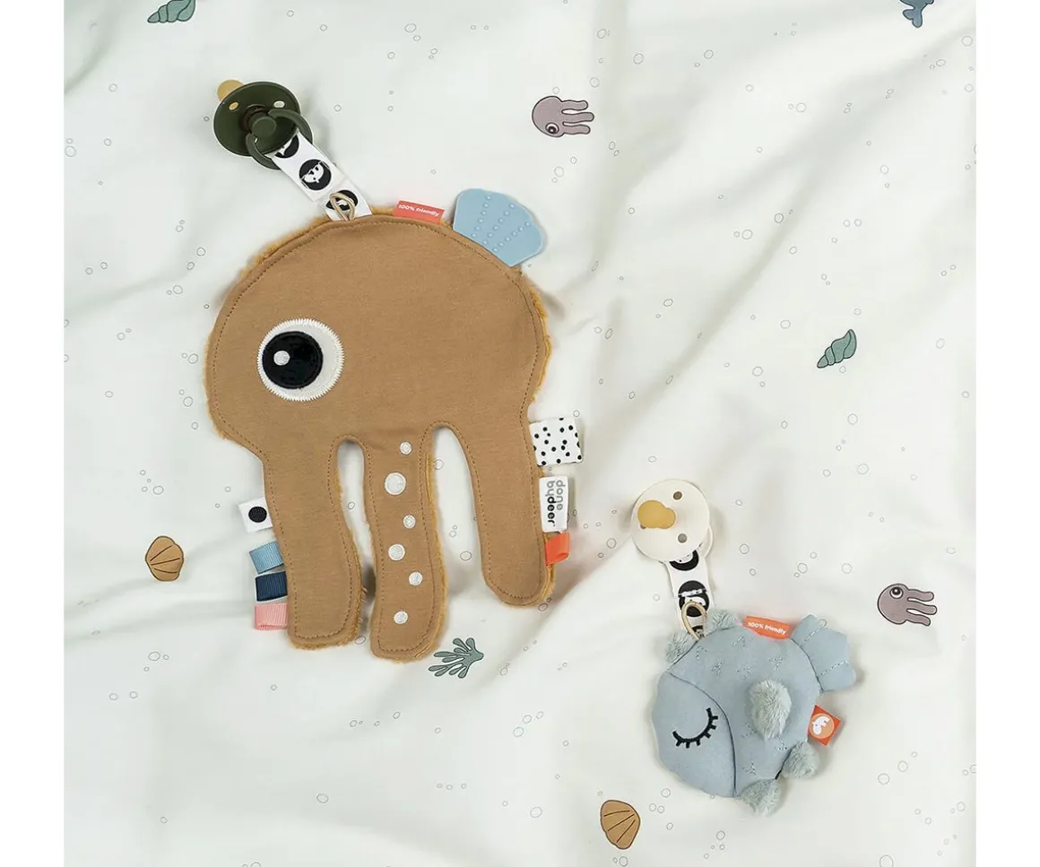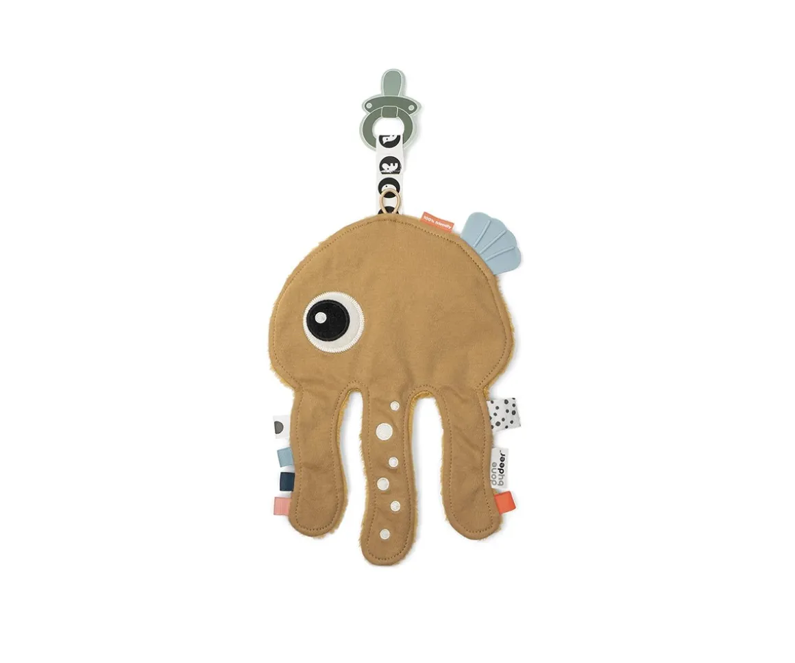 Los más pequeños pueden acurrucarse con el trapito de Jelly. Los deditos pueden agarrar fácilmente los tentáculos de la dulce medusa de Jelly y se divertirán explorando las coloridas etiquetas, las diferentes texturas y formas. Este trapito además es un chupetero y podrá tener el bebé su chupete siempre a mano porque se puede acomplar a uno de los extremos.