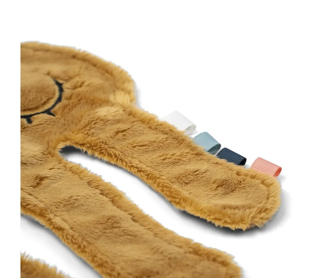 Un reconfortante amigo de Done by Deer para tu bebé, en un suave tono blush con detalles de lunares contrastantes y etiquetas de colores que le darán a tu pequeño una experiencia sensorial.