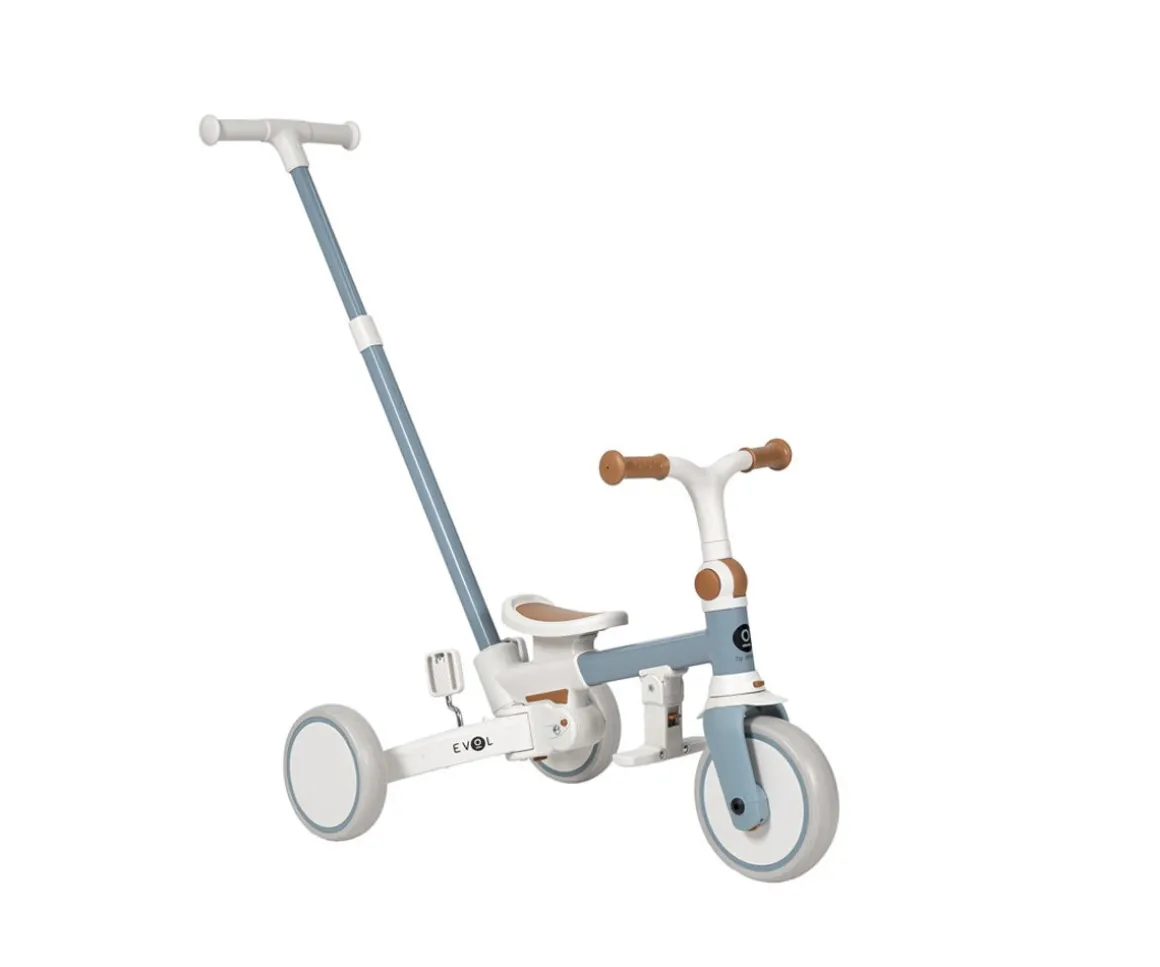 Este triciclo se irá transformando y adaptando a medida que el niño o niña crece. De triciclo a bicicleta con o sin pedales, pasando por todos los modelos necesarios para la adaptación del niño. Es adecuado a partir de los 12 meses y viene con una barra de empuje extraíble que se puede colocar en la parte posterior del triciclo para ayudar que el peque comience de manera más segura.
