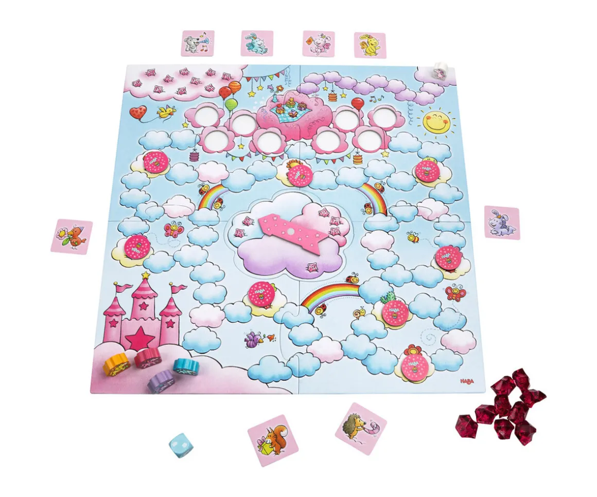 - El objetivo de este juego es reunir las 8 fichas de amigos y los cristales antes de que Rosalie llegue a la nube donde se celebra su fiesta. Con la ayuda del dado, los jugadores/as se van moviendo por las nubes de colores del tablero en busca de las fichas redondas de amigos o de cristales
