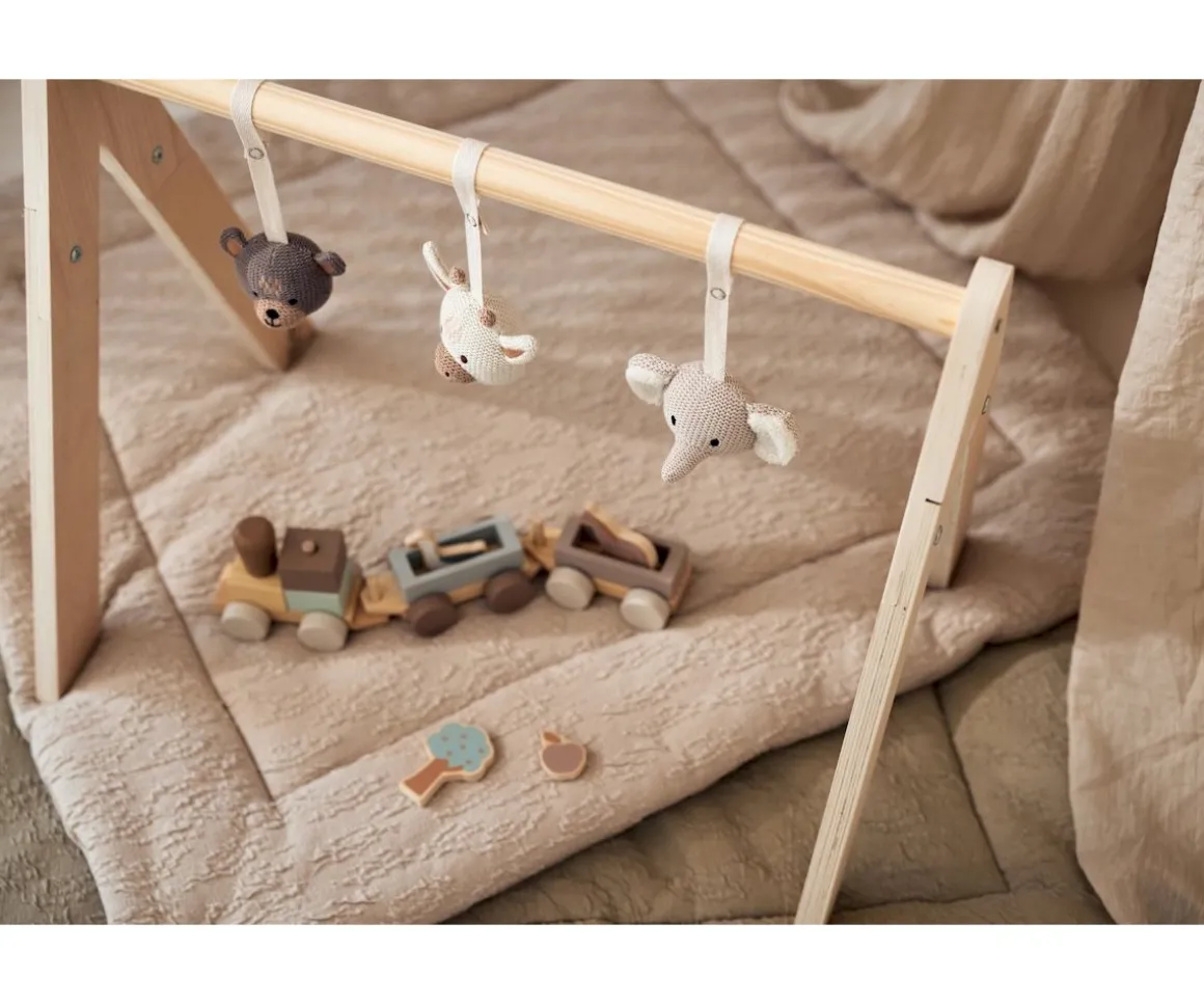 Tres figuras colgantes con agarre mediante clip para los gimnasios infantiles. Set formado por las cabezas de una bonita jirafa, un osito y un elefante.