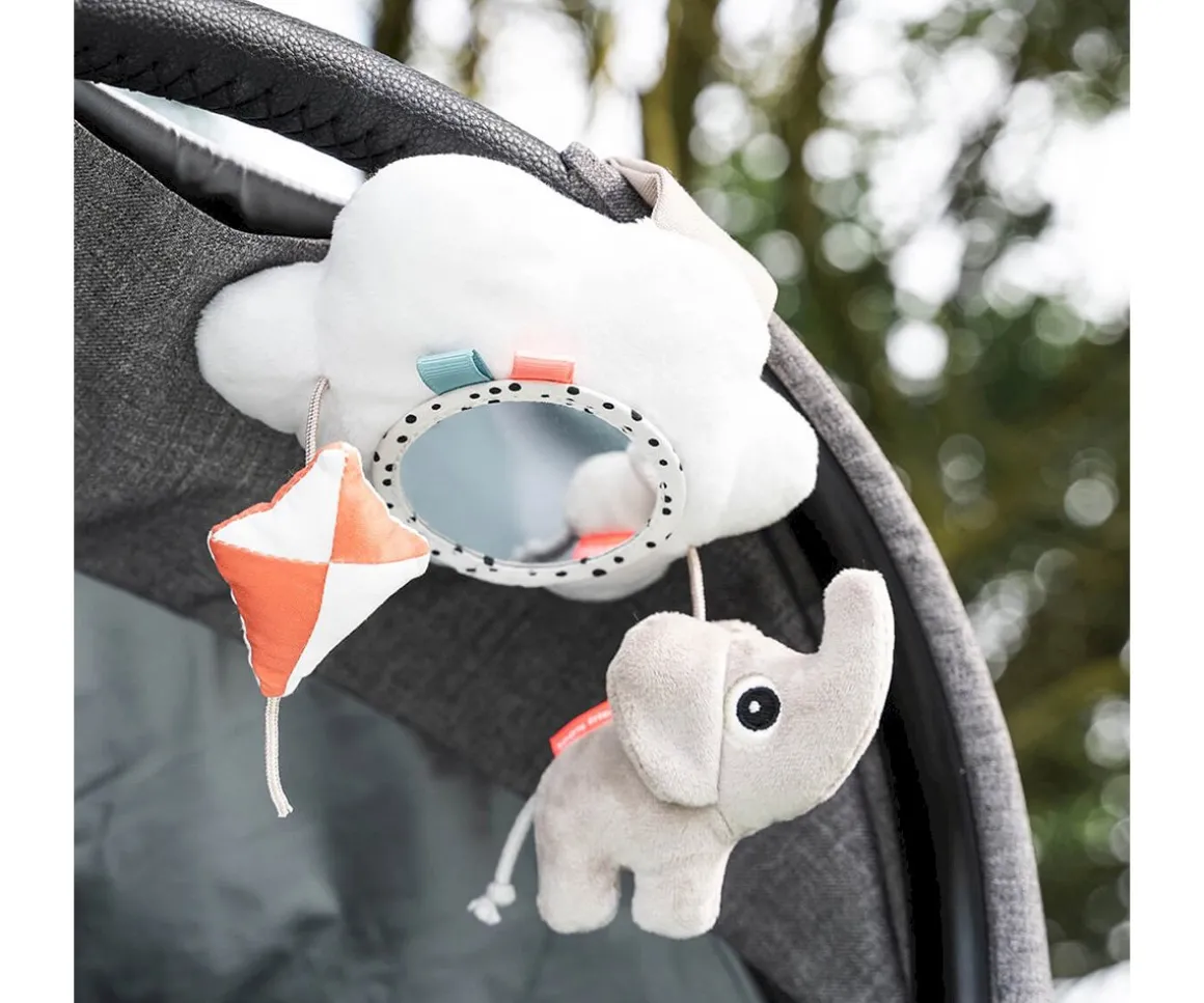 El juguete Playground de Done by Deer incluye un espejito para descubrirse, etiquetas para poder manipular, un bonito elefante y una cometa.