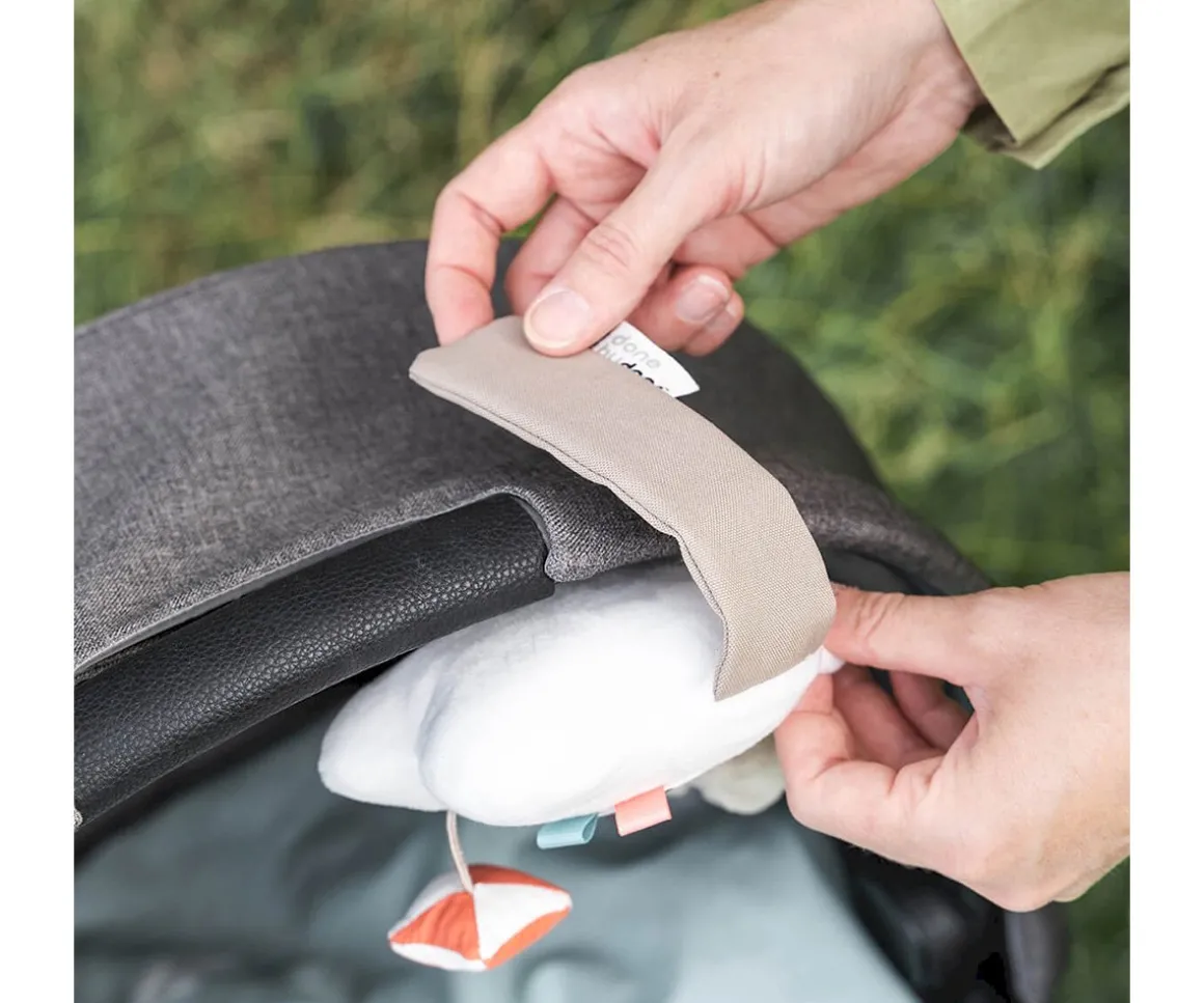Podrás sujetarlo con su cierre imantado en la silla de paseo, en el cuco, en el cochecito, en el gimnasio infantil o en la cuna.