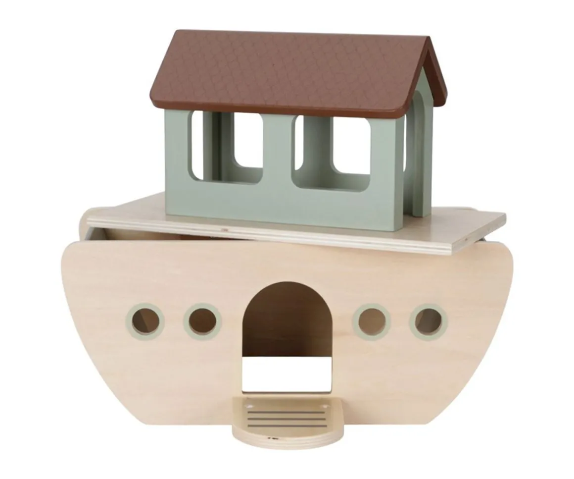 Ayuda a los animales a encontrar a sus parejas y prepáralos para el viaje. Incluye el arca con una puerta y una pasarela desmontable, además de Noé, su esposa y una gran variedad de animales en parejas: palomas, gallina, gallo, tortugas, monos, leones, avestruces, tigres, vacas, toros, osos polares, cocodrilos, jirafas, cebras, elefantes y camellos.