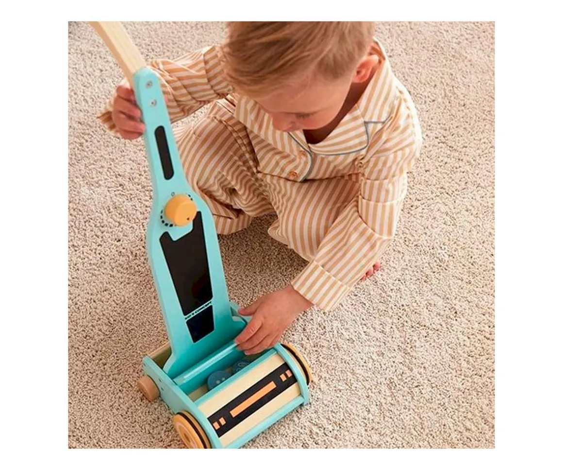 Aspiradora de madera mint retro con discos magnéticos de suciedad. Un set completo que cuando haces rodar la aspiradora atrapa los discos magnéticos y los deja en un compartimento interno que puede vaciarse para limpiar.