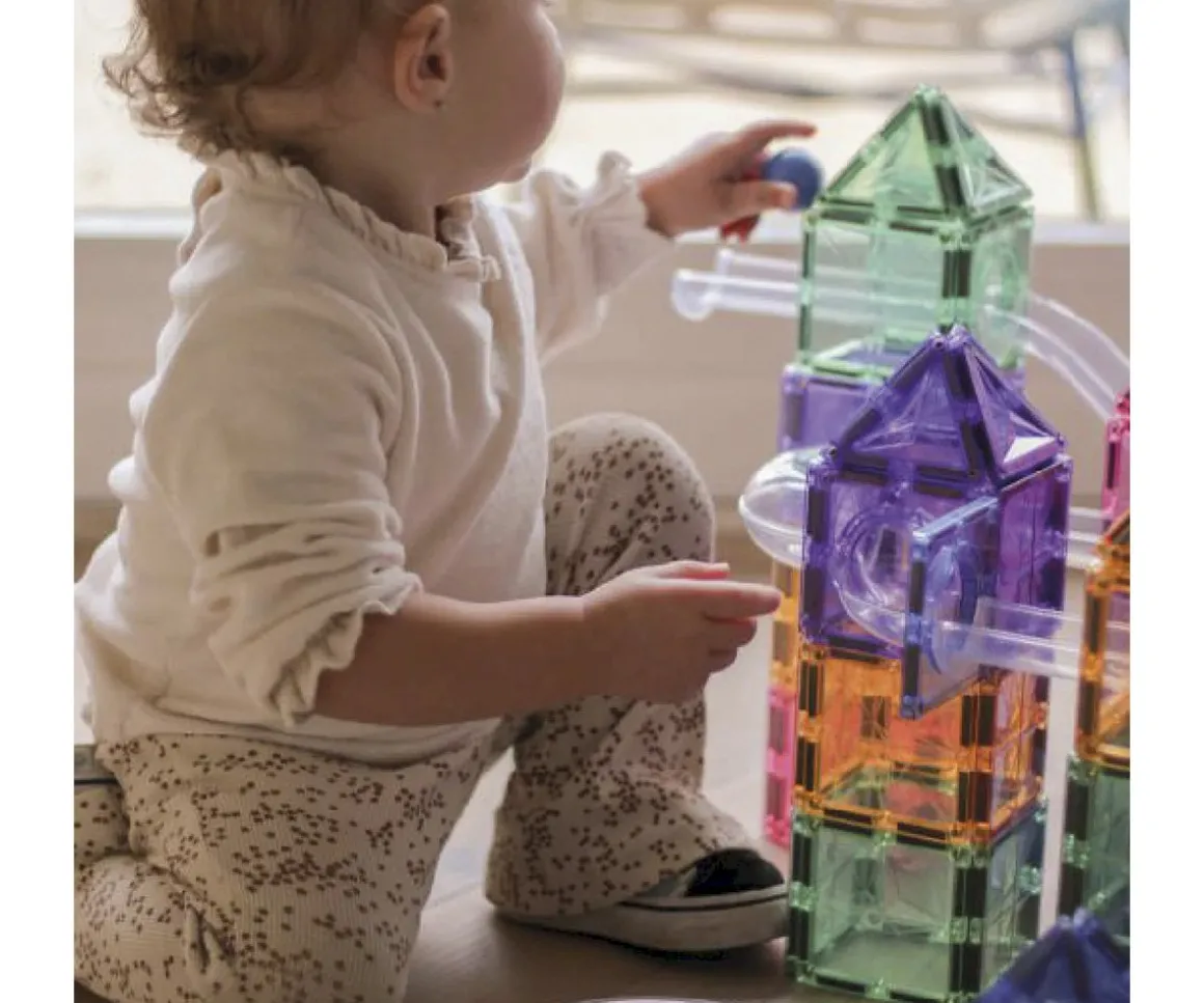Este circuito con bolas de Cleverclixx en tonos pastel incluye 110 piezas, ideal para dar rienda suelta a la imaginación de los peques. Con imanes que facilitan la construcción, los niños pueden crear estructuras divertidas y originales.