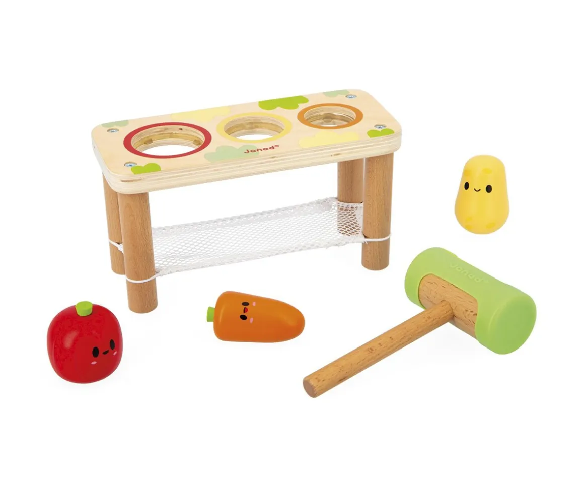 Este banco con martillo de Janod viene con 3 bonitas verduras, un tomate, una patata y una zanahoria que será el pasatiempo favorito de tu peque.