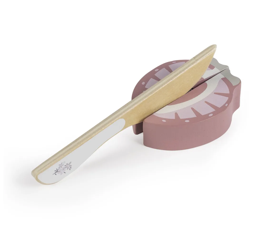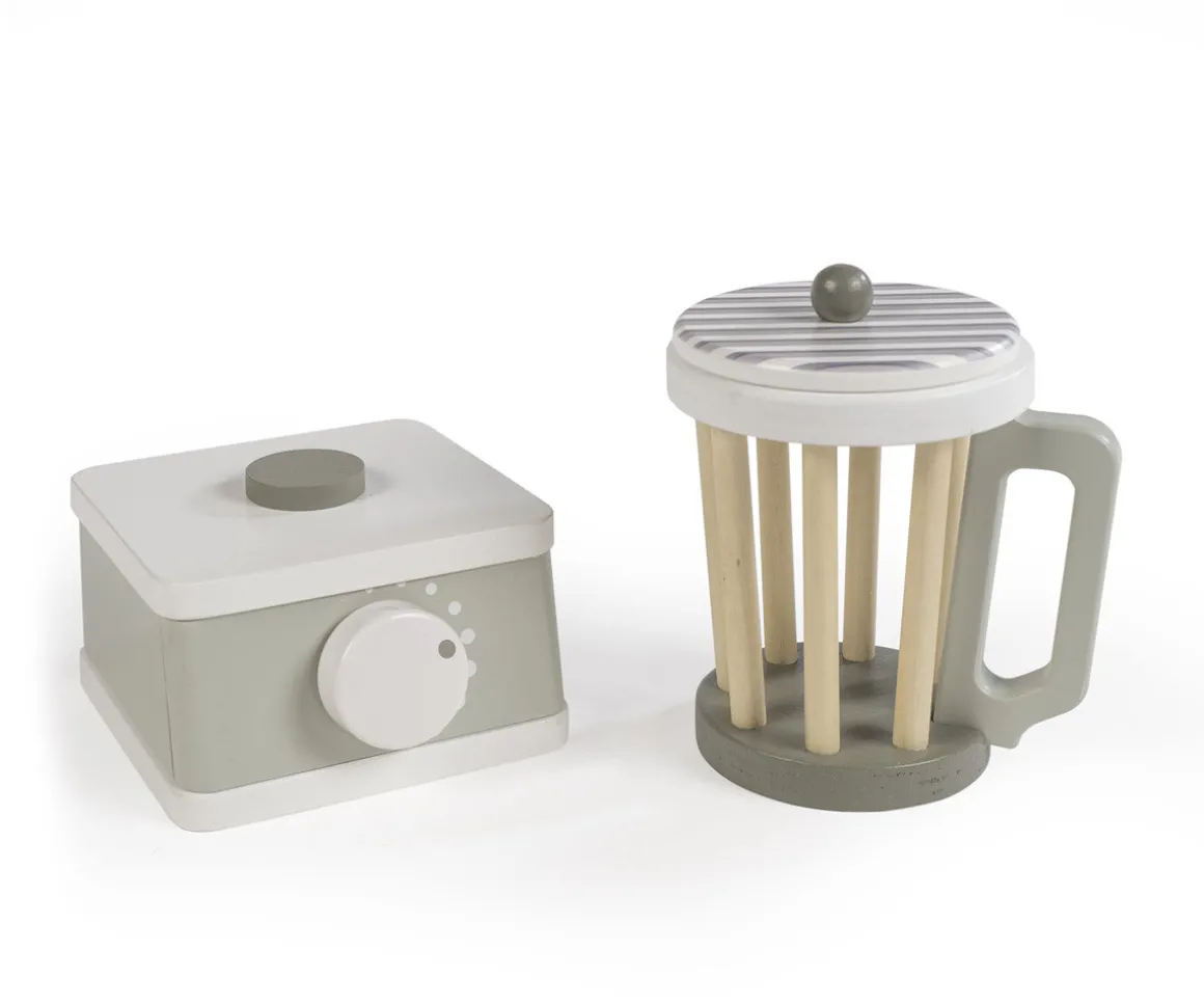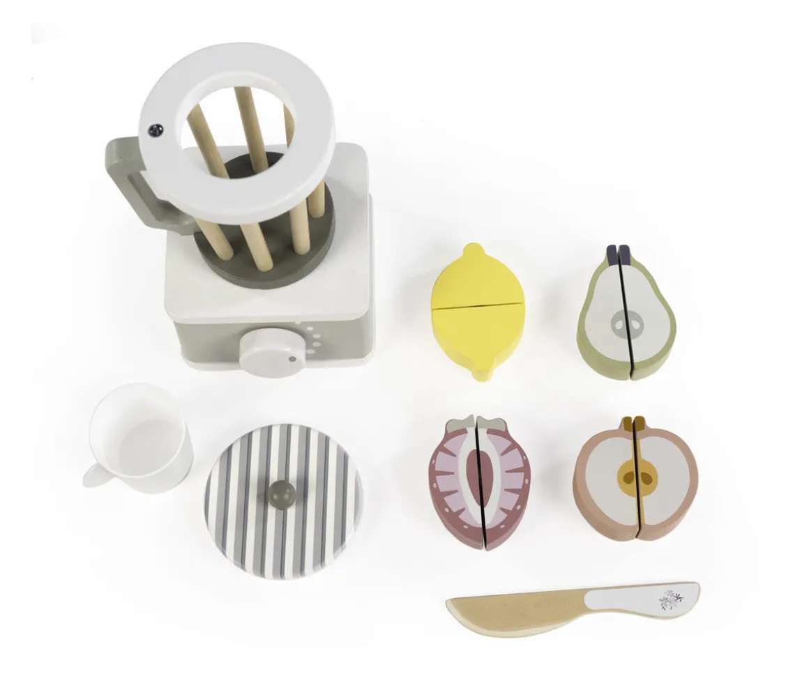 - Incluye la batidora, una taza, una cuchara y una variedad de frutas de madera (plátano, pera, fresa y manzana) que se pueden «cortar» por la mitad gracias a su diseño con velcro