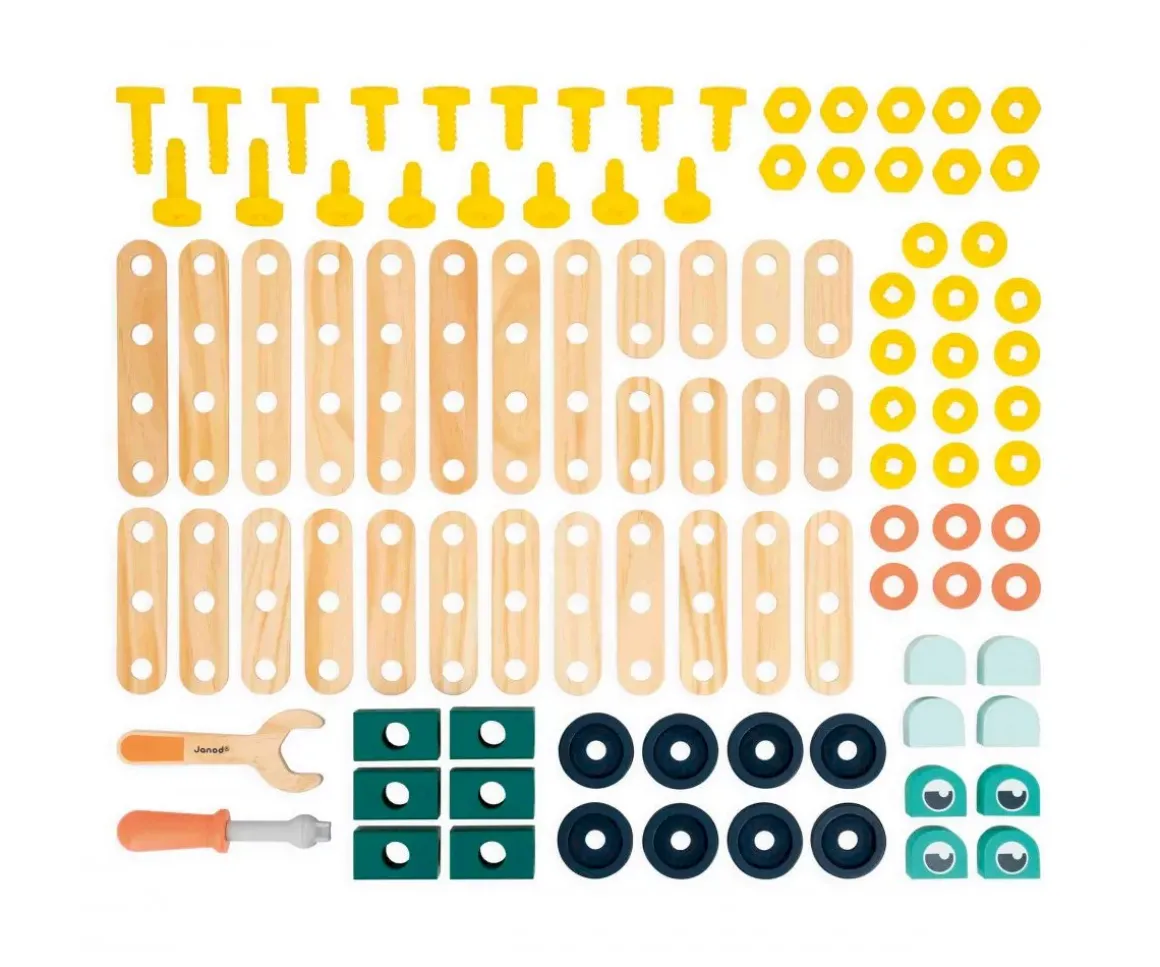 - Incluye: 28 placas, 8 ruedas, 6 arandelas, 4 ojos, 10 bloques de madera, 10 pernos, 14 inserciones, 18 tornillos, 1 destornillador y 1 llave inglesa, 10 tarjetas con ejemplos e instrucciones